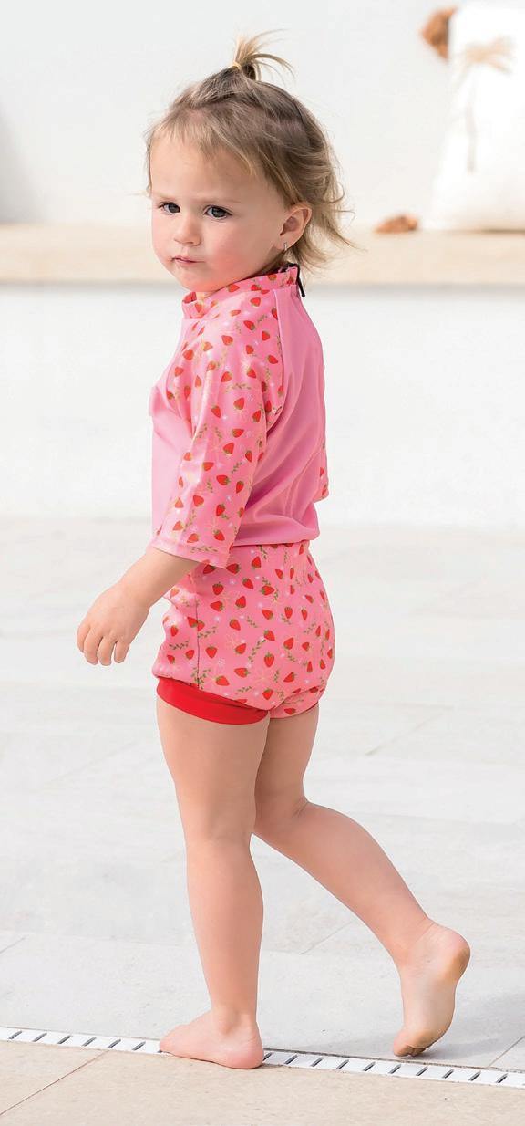 Made from lightweight Nylon Lycra, the soft, stretchy sunsuit body is designed to keep little ones cool while three-quarter sleeves and a high neck protects young skin from the sun’s harmful rays. In the water, the form- tting neoprene Happy Nappy provides maximum protection against unwelcome faecal leaks.