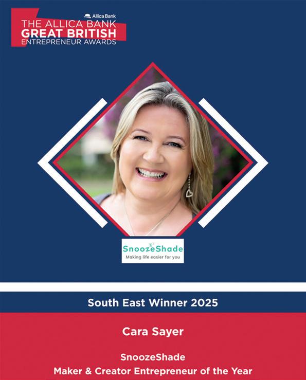 Cara Sayer, inventor of SnoozeShade and its Chief Sleep O cer, has been awarded the Maker & Creator Entrepreneur of the Year for the South East region, in the 2025 Allica Bank Great British Entrepreneur Awards. Up against thousands of entrants Cara stood out for her courage, ingenuity and results – it’s a win she is incredibly proud of.