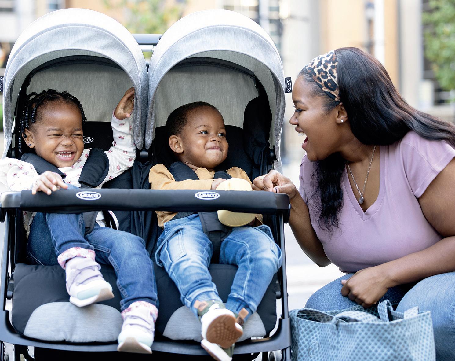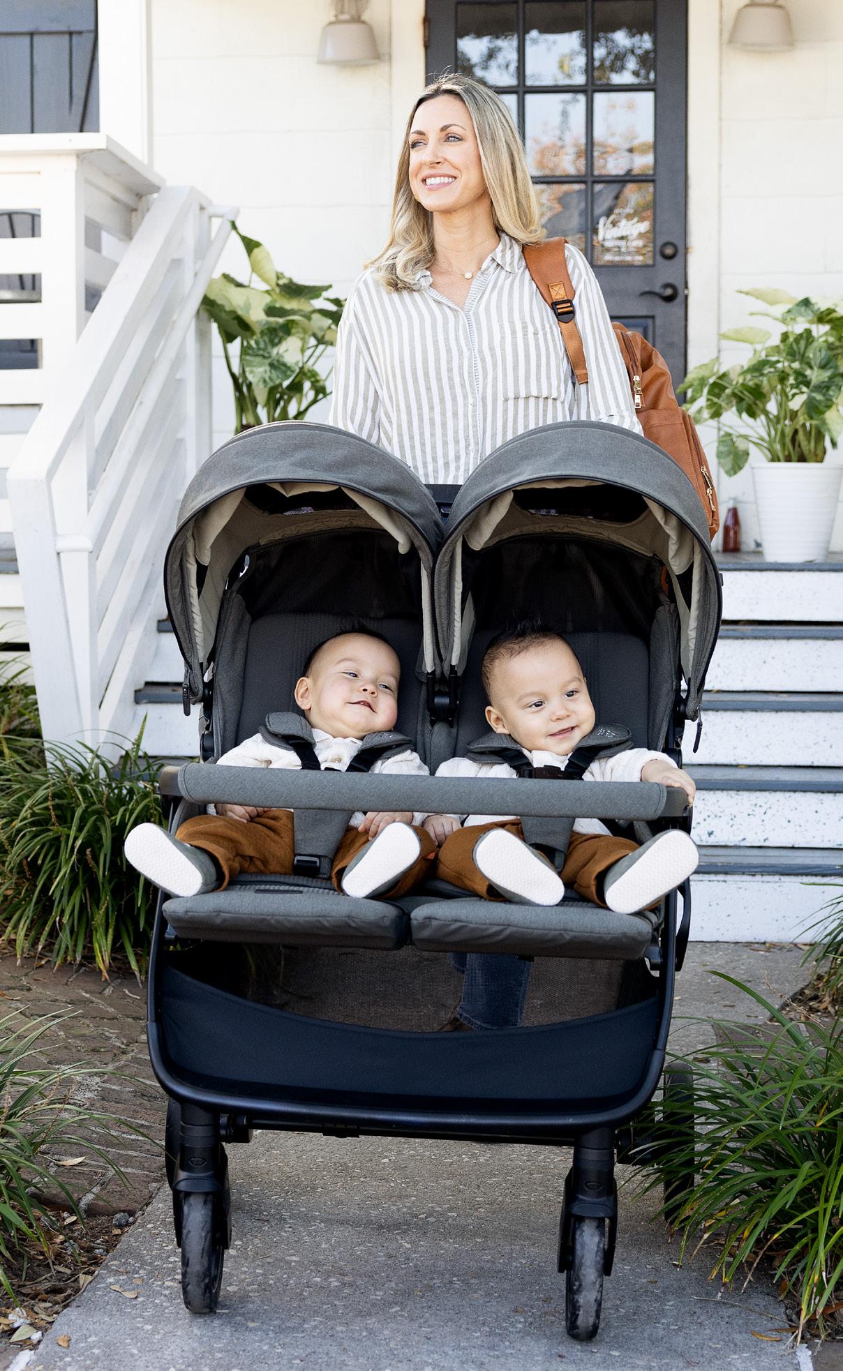 Deluxe lightweight double stroller featuring two customisable seats for adventures with little ones who want it their way.