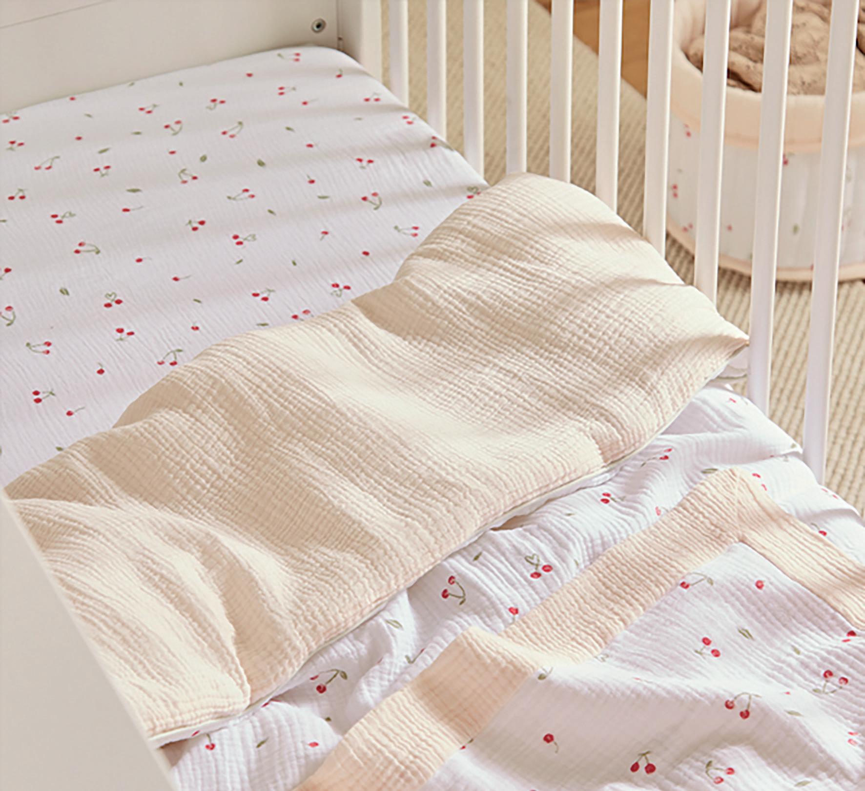 The Ditsy Cherry range, pairs a delicate cherry print with breathable cotton muslin, adding a nostalgic, playful touch.