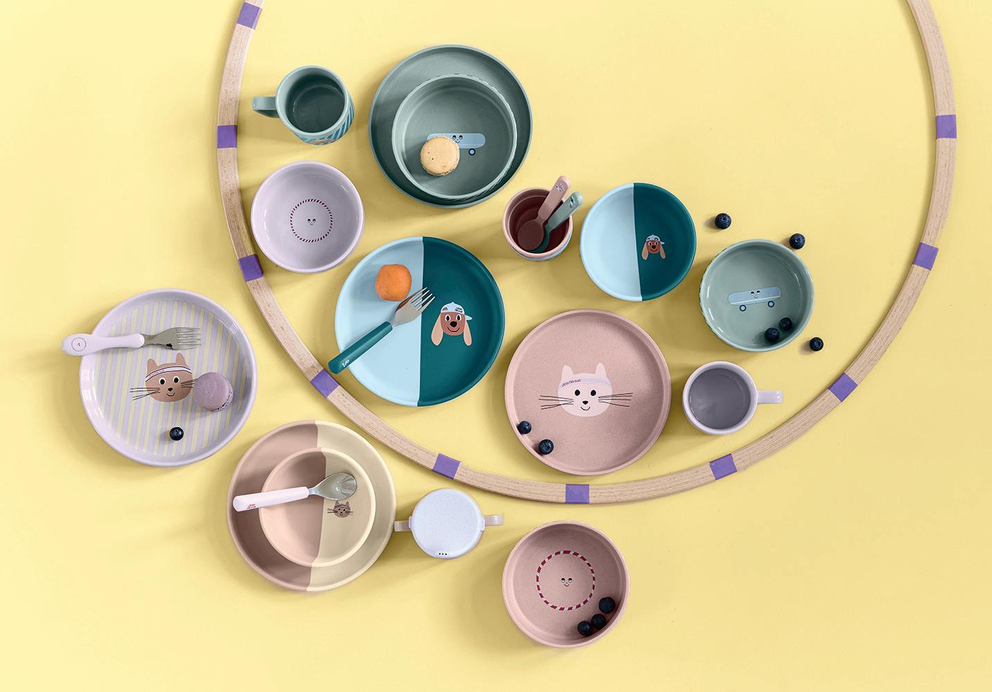 The collection includes plates, bowls, mugs and sippy cups made with cellulose to reduce the use of limited resources, exible silicone section dish sets and bibs that are lightweight, durable and BPA-free.