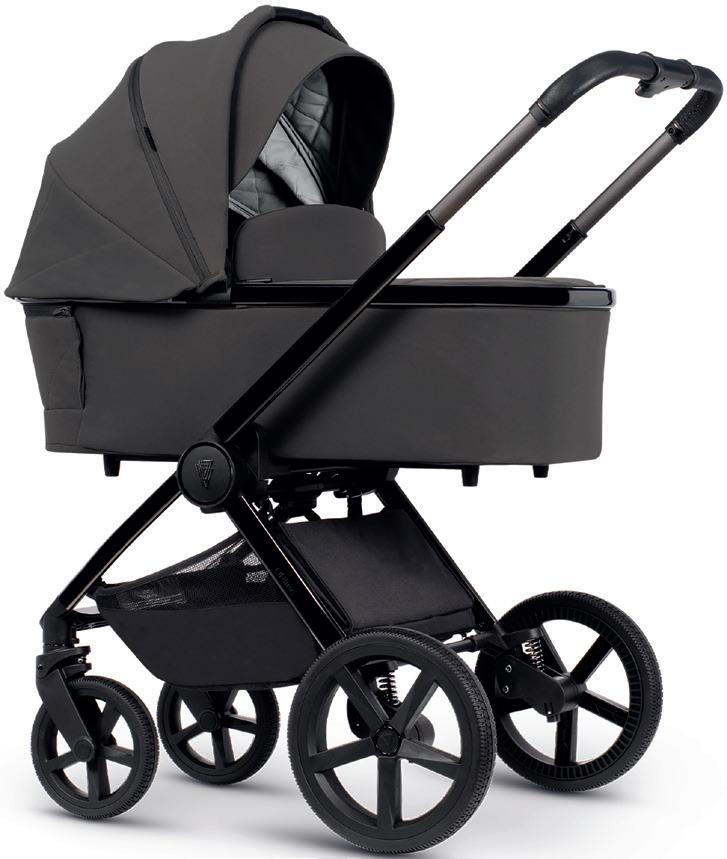 Styled on a sultry black matte aluminium frame colour and nished in textured luxury fabrics in Stone Grey with black eece lining in the boots. Suitable from birth up to a maximum weight of 22kg per seat.