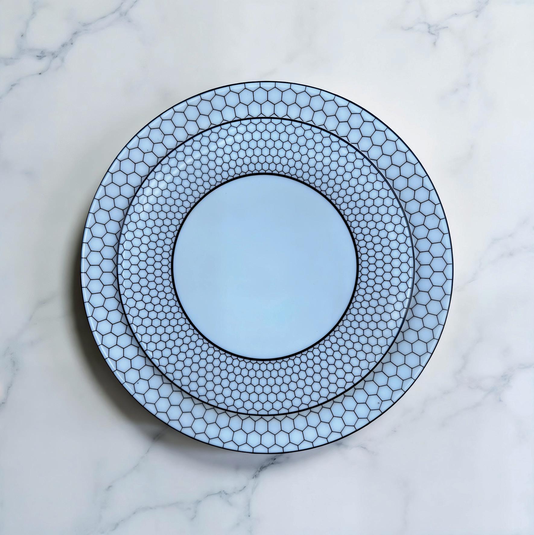 Artfully combining classic inspiration and contemporary aesthetics, these elegant fine bone china forms feature bold blue applied as highlights and eye-catching pinstripes.