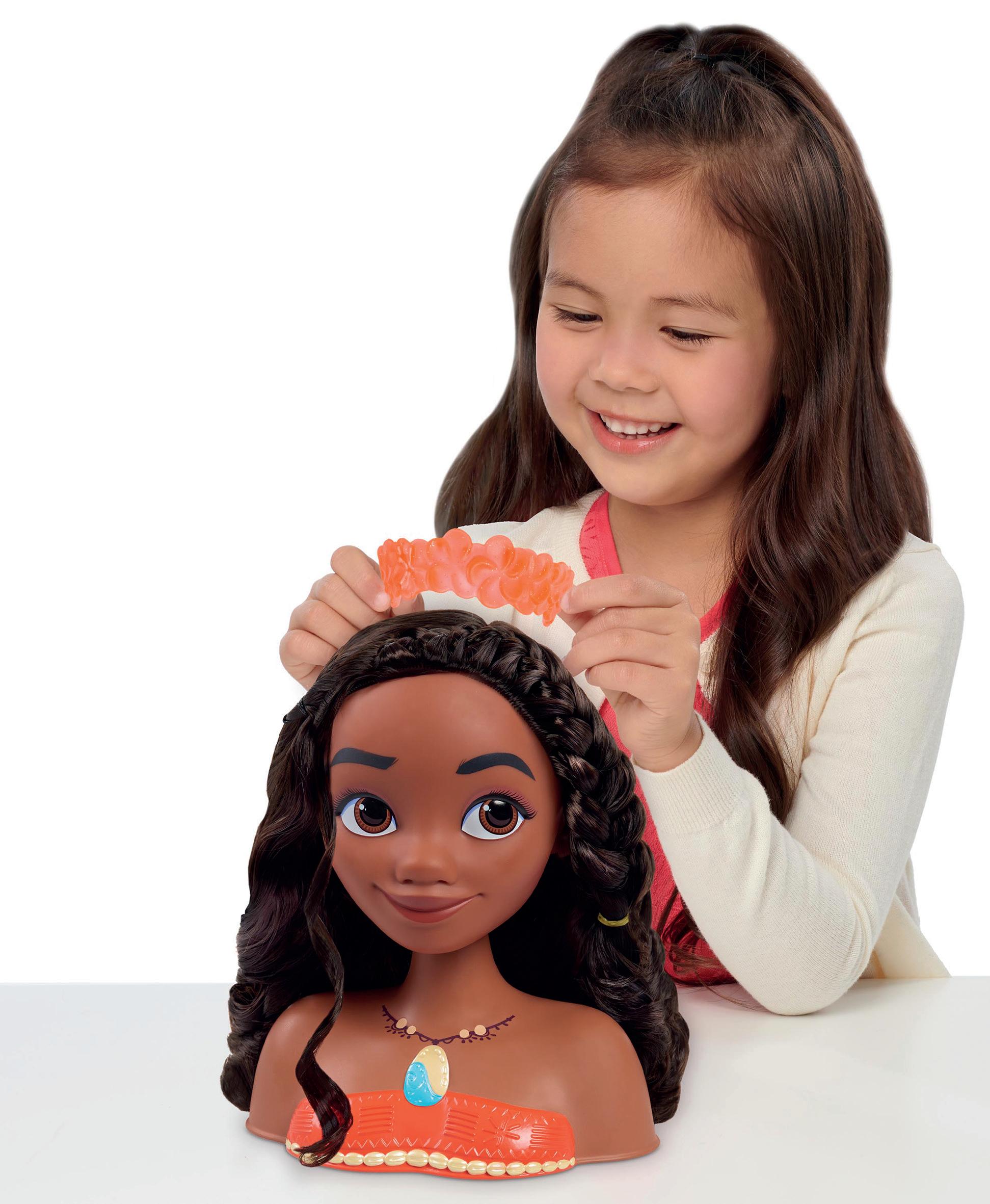 The Disney Princess Moana Styling Head lets little hairdressers comb, twist, and curl Moana’s hair into beautiful new looks. Kids will love using their creativity to create signature buns, breezy braids, ponytails, and wavy curls. Sparkly hair accessories can be mixed and matched with the Disney Princess Moana Styling Head, with so much glamour to share, including an orange flower crown.
