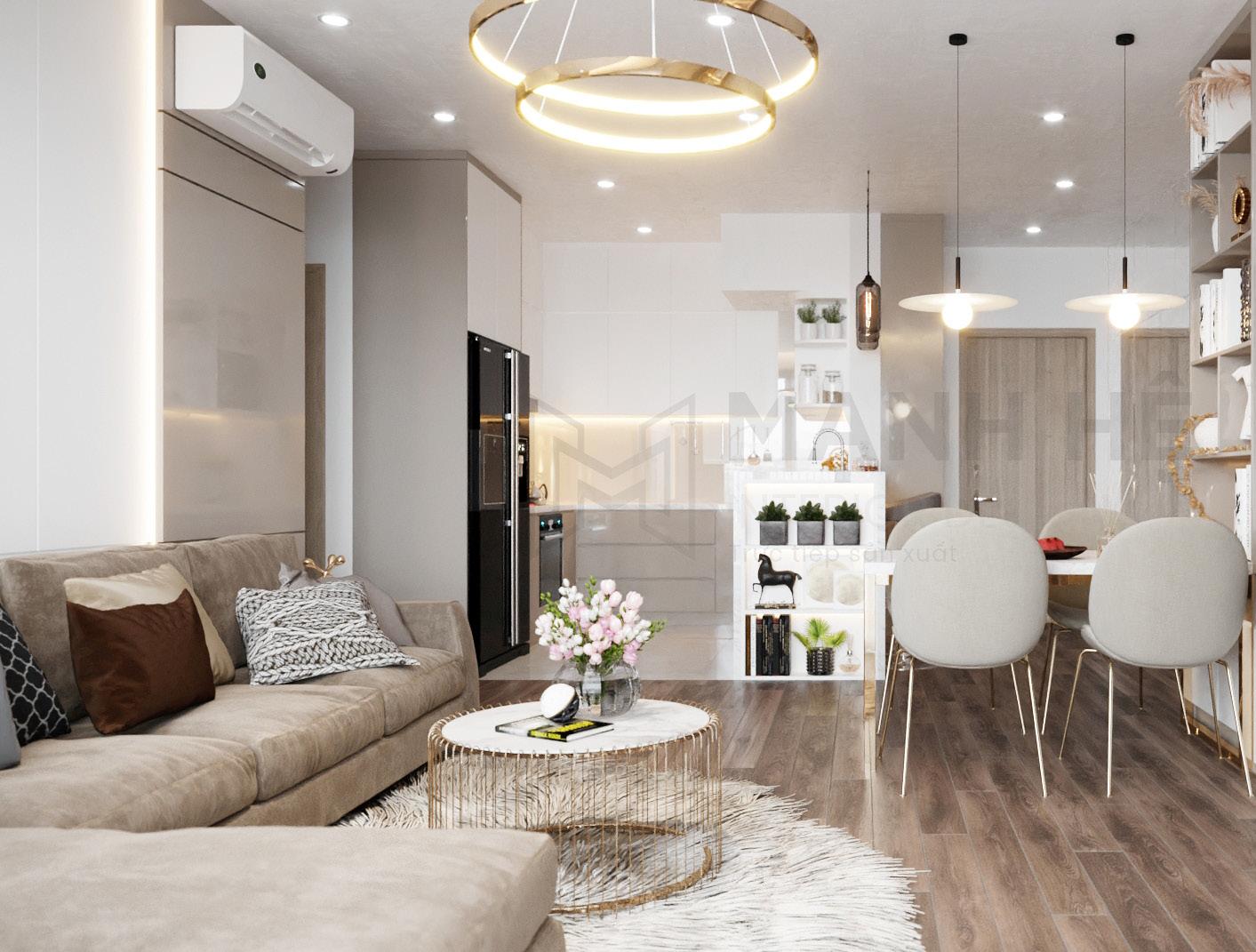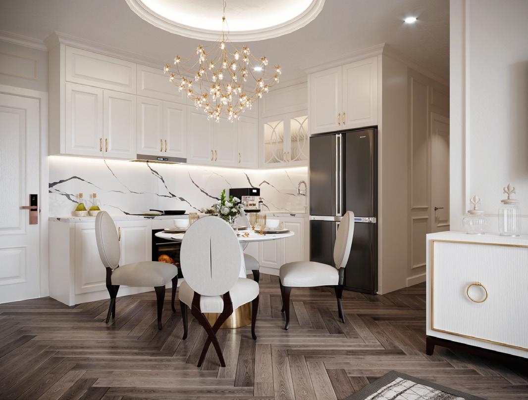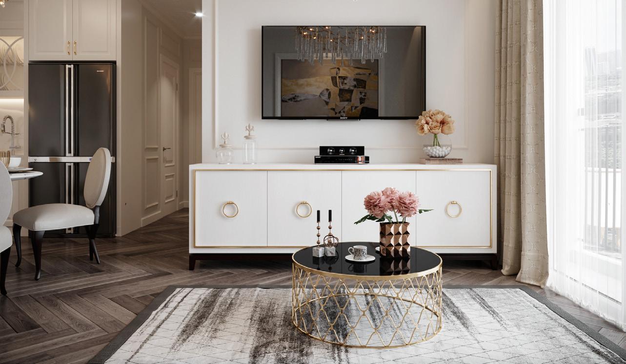 Chung cư Diamond Riverside 72m2 được thiết kế theo phong cách tân cổ điển, với gam màu chủ đạo là be kem kết hợp với nội thất màu trắng bằng gỗ tự nhiên được trau chuốt đến từng chi tiết nhỏ.