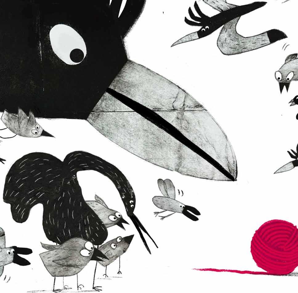 JURY REPORT This strong, graphic illustrative style with bold compositions and texture was loved, as was the way the artist used stark negative space, concentrating solely on the bird characters with little background or setting. The use of tones of black and grey to compose the art, with the additional pop of reddish-pink in the wool was used alongside crops to striking effect.