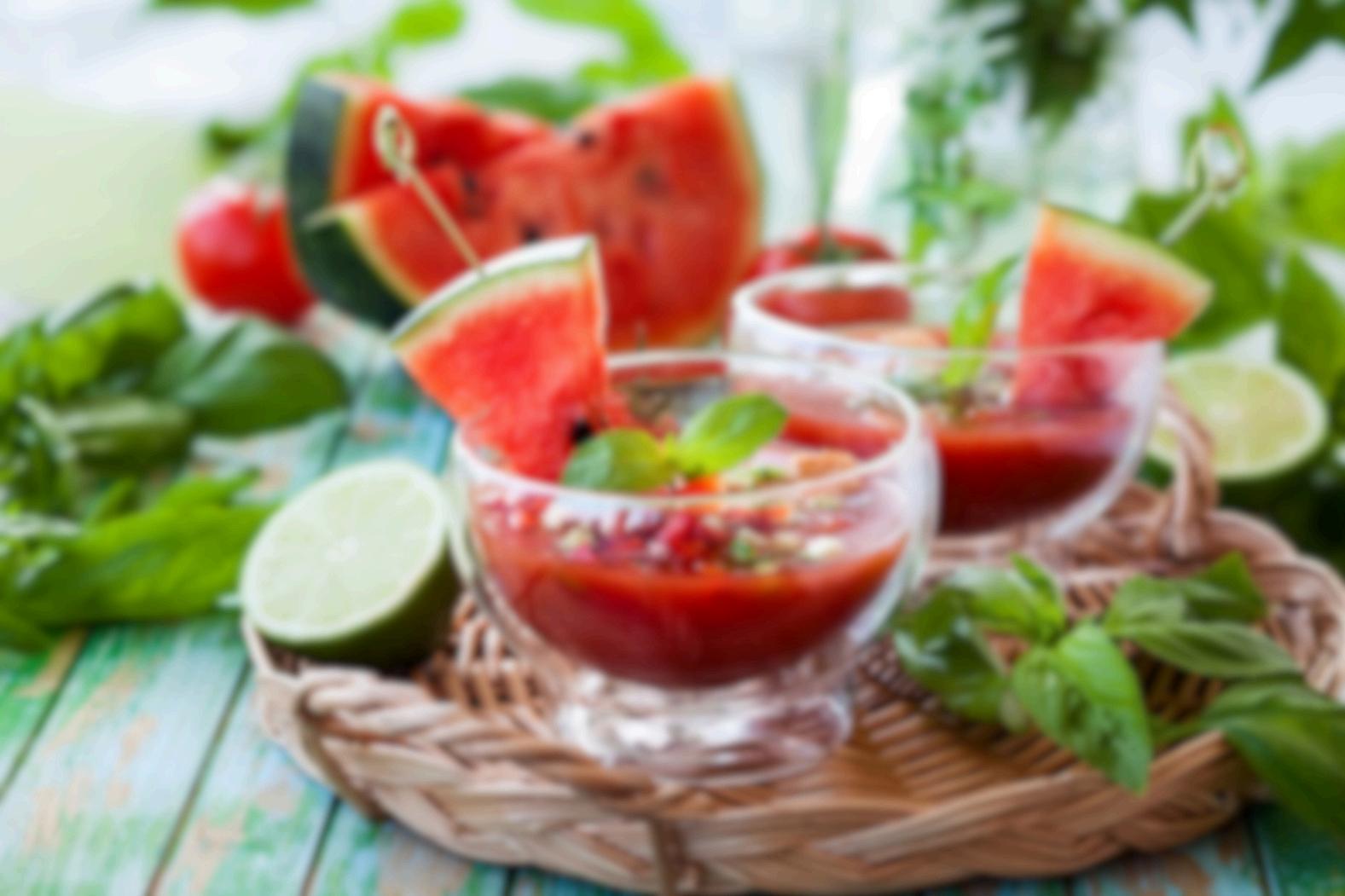 In a blender, combine watermelon, cucumber, red bell pepper, red onion, and jalapeño