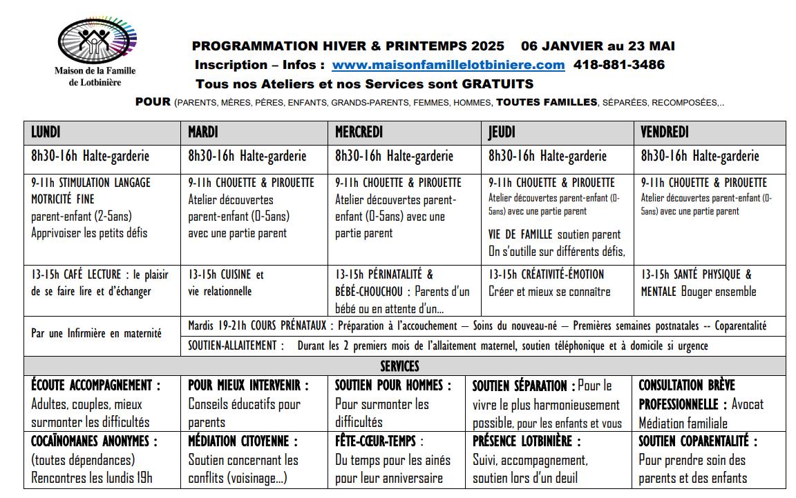 L’horaire peut être modifié à tout moment Pour les dernières informations, consultez la page Facebook « Loisirs Saint-Narcisse »