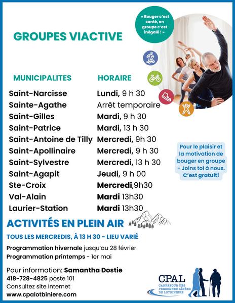 Le 29 septembre, les séances VIACTIVE ont recommencé et ce sera tous les lundis de 9h30 à 10h30 à la salle FADOQ
