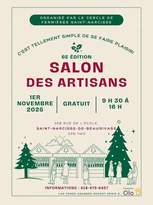 Le 1er novembre 2025, venez encourager les artisans à la 6e édition du Salon des artisans de 9h30 à 16h00 C ’’est gratuit