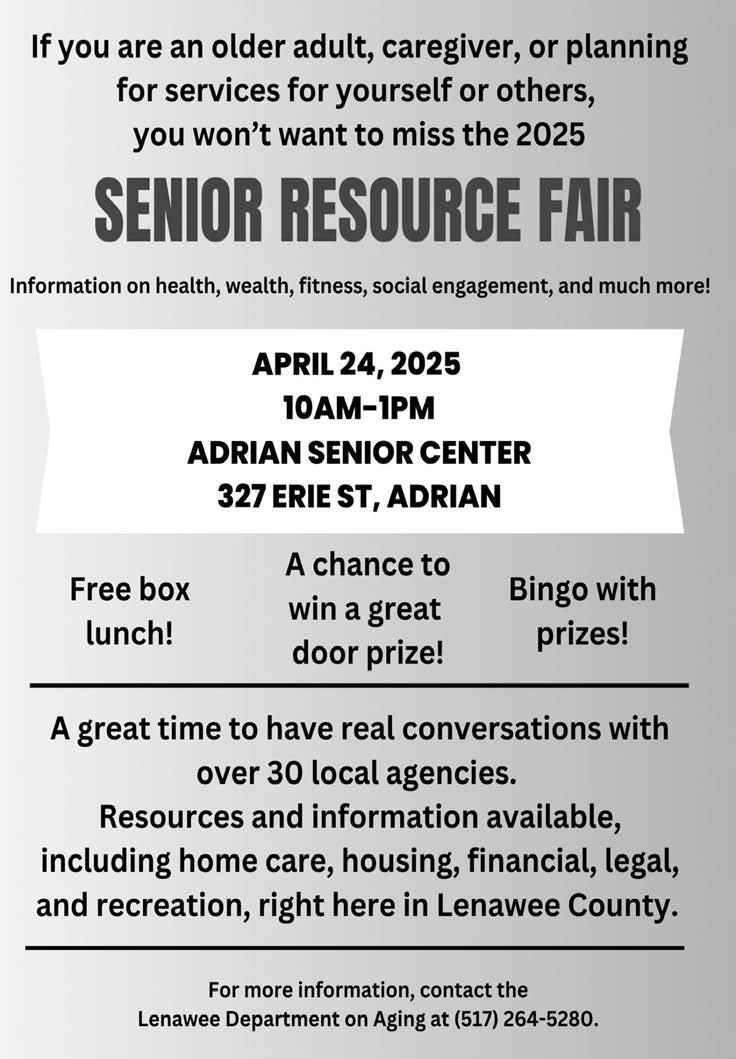 Attend this free seminar to learn about scams that are prevalent in our area. 348 Erie St., Adrian www.adrian.lib.mi.us or 517-263-3585