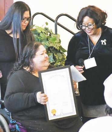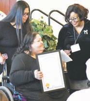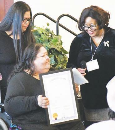 Delma Bosquez-Munoz (centro) acepta un premio por servicio comunitario de Pamela Hall (derecha), mientras su hija, Veronica Perez, observa.