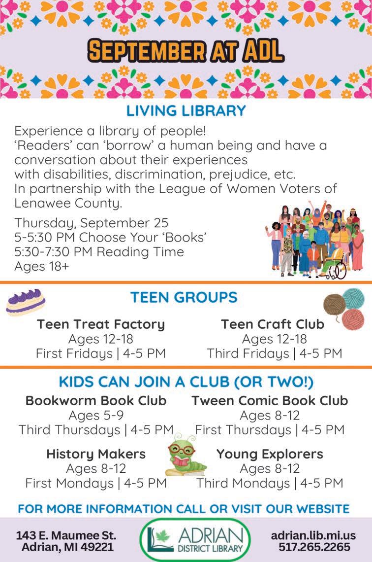 American Legion, 10:30 a.m. September is Suicide Prevention Awareness Month and this event shines a light on the reality that approximately 22 veterans die by suicide each day. The ruck/walk route travels from the American Legion Helicopter, through downtown Adrian, to Comstock Park, and back to the starting point. Volunteers will be stationed along the route to assist and guide participants. Register at eventbrite.com/e/ruck-to-remember-2025tickets-1417210818709.