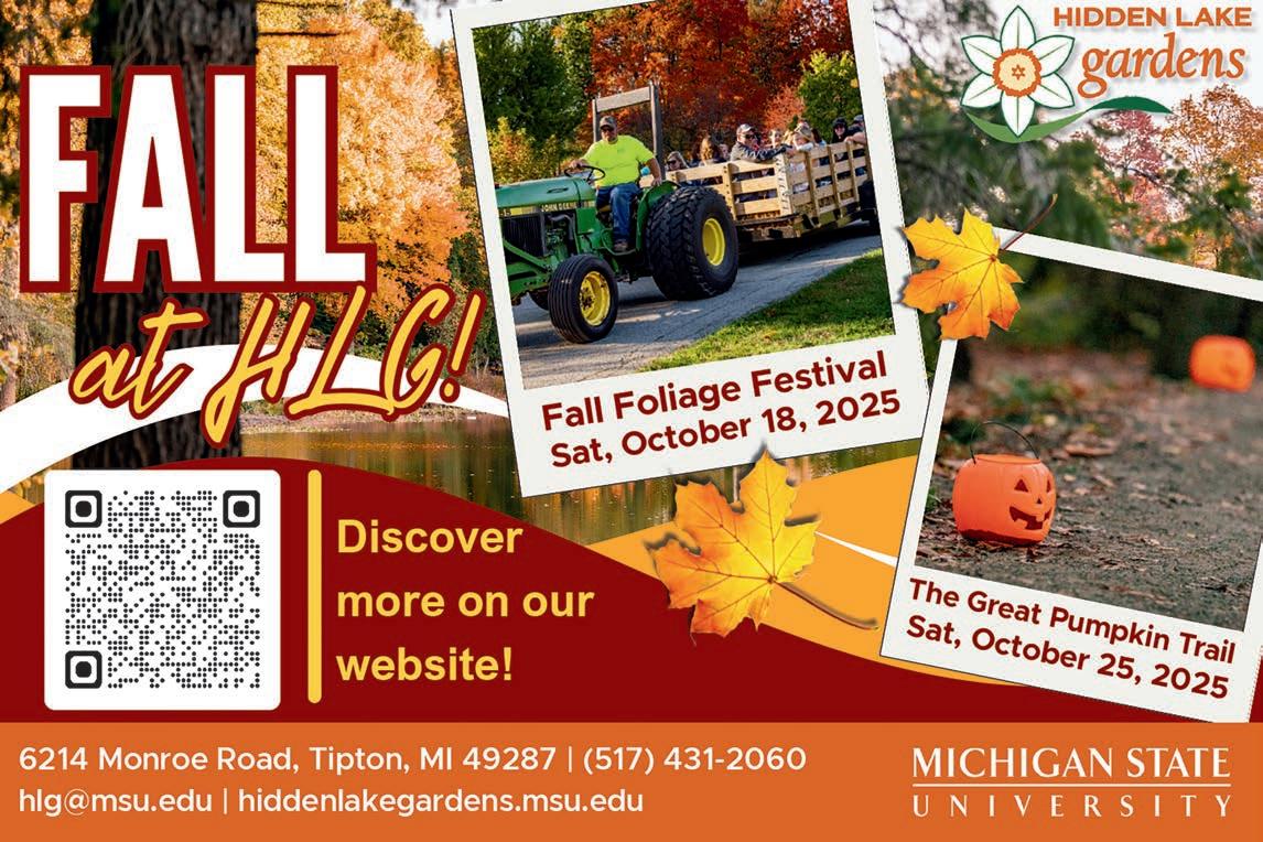 6214 W. Monroe Road, Tipton hiddenlakegardens.msu.edu or 517-265-8399