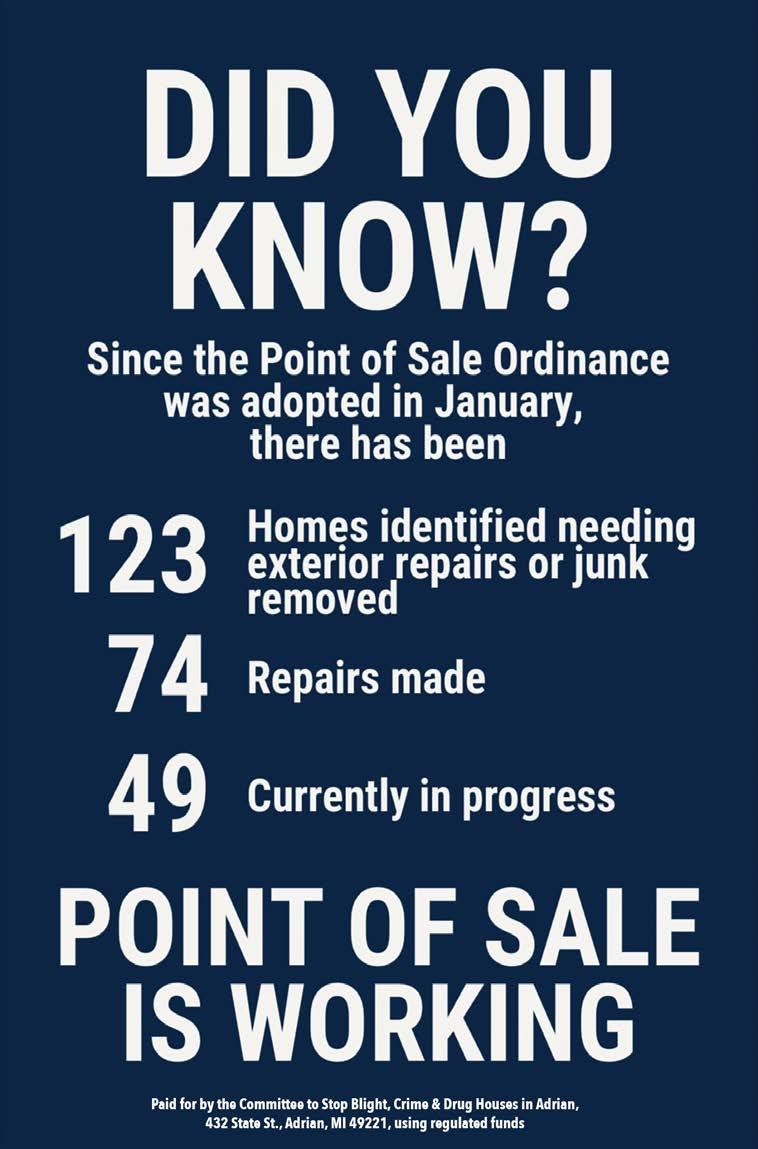 ADRIAN — Adrian’s point of sale ordinance would be repealed if a proposal on the city’s Nov. 4 general election ballot is approved by voters.