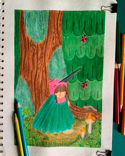 My illustration style leans towards children's art, where each stroke aims to narrate stories from everyday life, fantastical situations, and elements of nature. I enjoy the creative process, constantly exploring di erent tools and techniques to build projects through the lens of my artistic universe. My preference for handmade work is re ected in my exploration of textures and the possibilities o ered by mixed media techniques. The vibrant color palette is a distinctive element of my work—and my personality!—bringing my characters and stories to life.