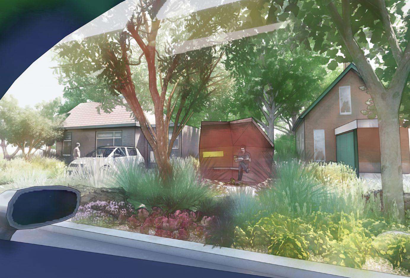 Perspective showing rain gardens, bird waterers and seating areas along Brockway Road