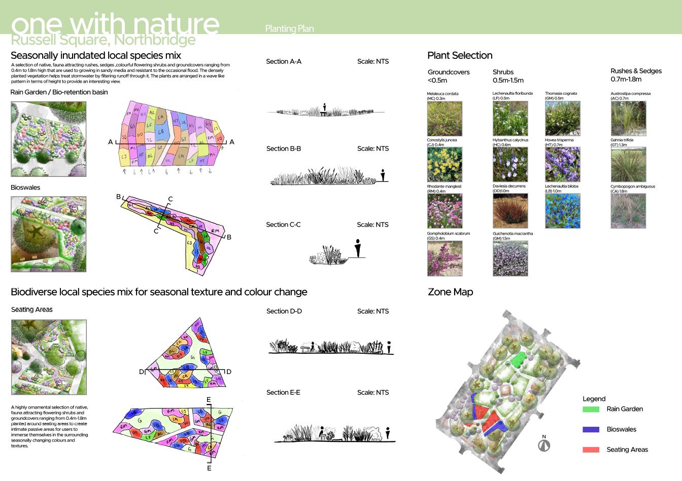 One with Nature aims to rejuvenate Russell Square as an urban parkthat allows interaction between the users and nature. This design adds both functional and aesthetic spaces to allow surrounding residents, businesses and their customers to share the space, creating an overlap between the space and its surroundings.