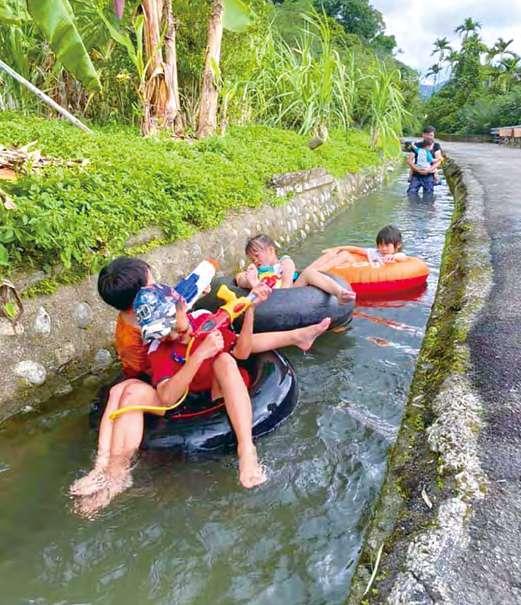 在地孩子乘著輪胎與游泳圈, 在圳道上一邊玩著漂漂河、水 槍戰,一邊認識生態。