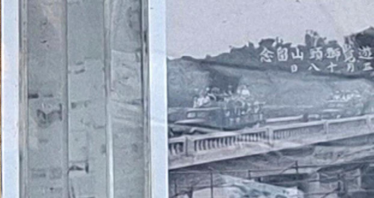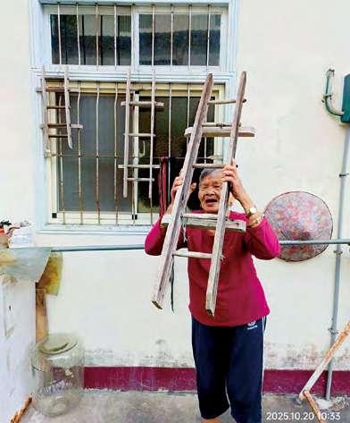 (右圖)現仍居天輪社區的池 媽媽,與拉木工具「木馬」的 合照。