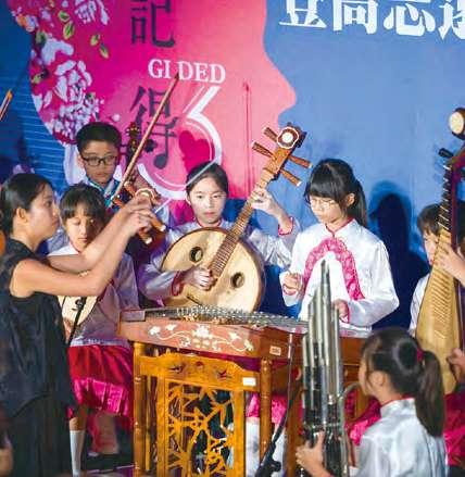 (左圖)瓊瑢舞蹈團帶來的開場舞《舞漾白鶴花》, 展現 薑花柔中帶剛之美。(右圖)東勢國小國樂 團帶來多首客家傳統曲目演出。
