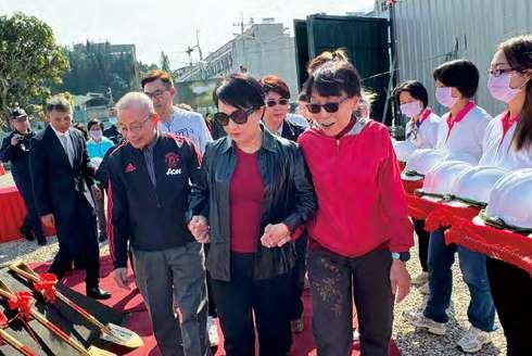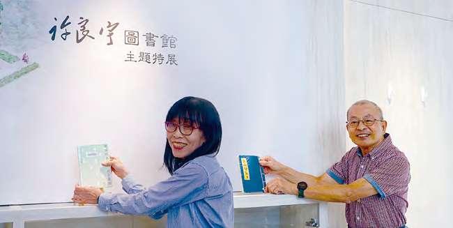 (左圖)許良宇圖書館的第一本書:許媽媽李碧虹放上許良宇 喜愛作家的作品,許爸爸許景堂則擺上兒子的篆刻作品集。 (右圖)2023年動土典禮上,盧秀燕市長與許爸爸、媽媽執 手前行,共盼這棟愛的圖書館開工順利。