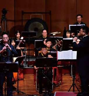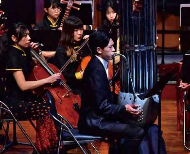 (左圖)市府客委會江俊龍主委代表市長盧秀燕 上臺獻花致意。(右圖)樂團新秀演奏家黃俊毓, 帶來《世外桃園》,笙樂悠揚。