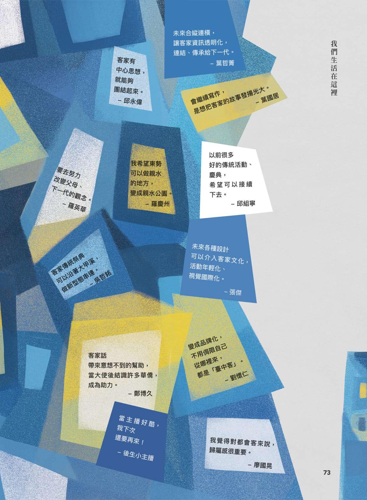 在共築的客家空間裡,有人想到熱鬧的客家市集美 食,有人想起節慶的新丁粄,也有人記得客語的有趣俗 諺。所有珍貴的生命片段,都化為樓宇中層層堆疊的生動 風景。你呢?你對臺中客家,又有什麼不同的想像?
