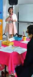 講著四縣腔客語的「真的有劇團」團長呂宛臻帶來自製戲偶與立體書, 分享她在兒童劇場與工作坊中,透過道具生動講故事的經驗。「新生一號劇 團」團長張世暘則以海陸腔客語與華語雙聲帶,帶動全場觀眾的笑聲。更帶 出文化能透過繪本被看見,也能轉化成戲劇被感受的結論。