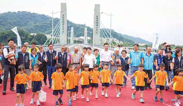 接著建設局長陳大田介紹,新橋採雙脊背鋼橋設計,橋寬拓至12公尺, 提升防洪與穩定安全,「能提前完工,是市府、施工團隊與在地居民共同的成 果。」最後,眾貴賓站在橋口,牽起彼此的手,山城也將迎向更安全、便利、 共榮的新篇章。