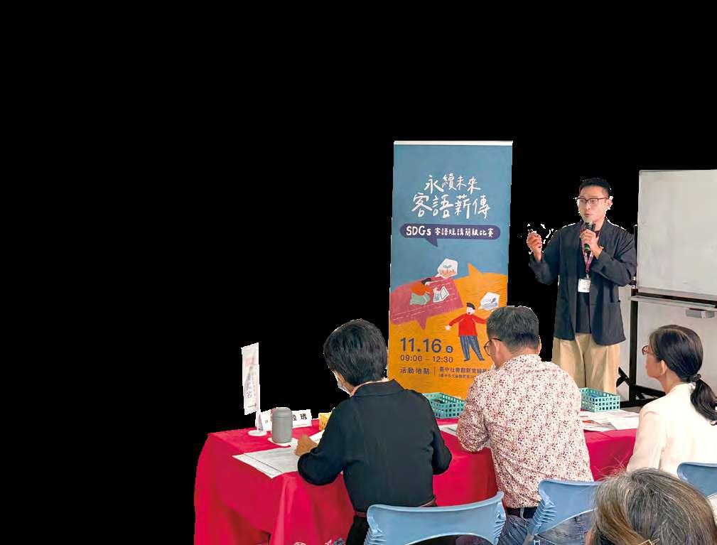 在掌聲中,致力推動客家藝文的市府客委會江俊龍主委,首先介紹繪本結合 客家與SDGs永續發展目標的特色,接著歡迎劇場、舞蹈與藝術工作者們, 以各自的母語和專業來分享。