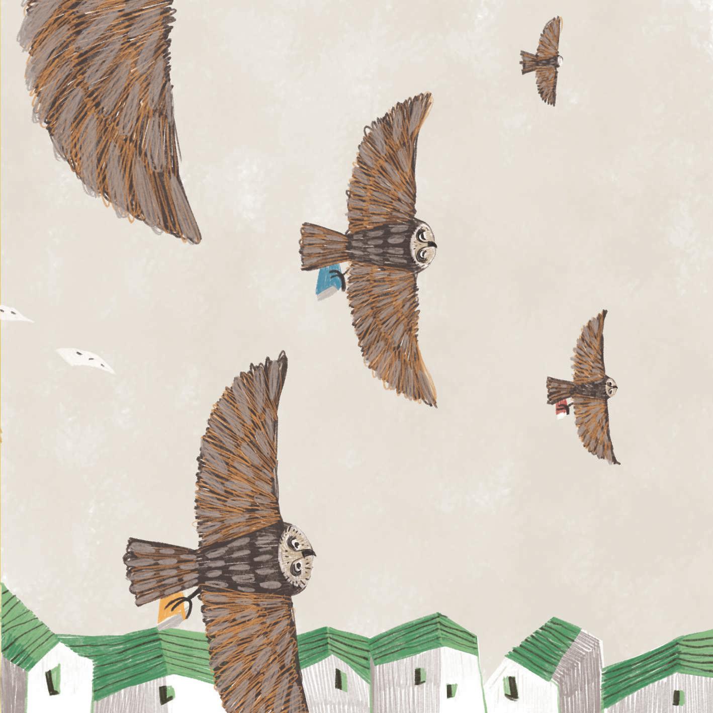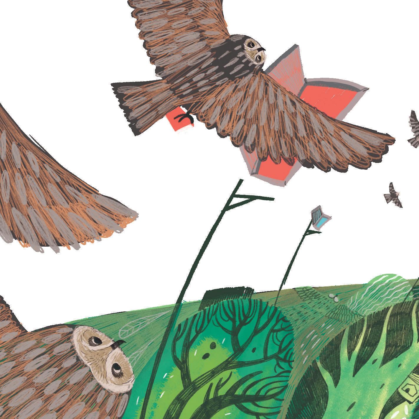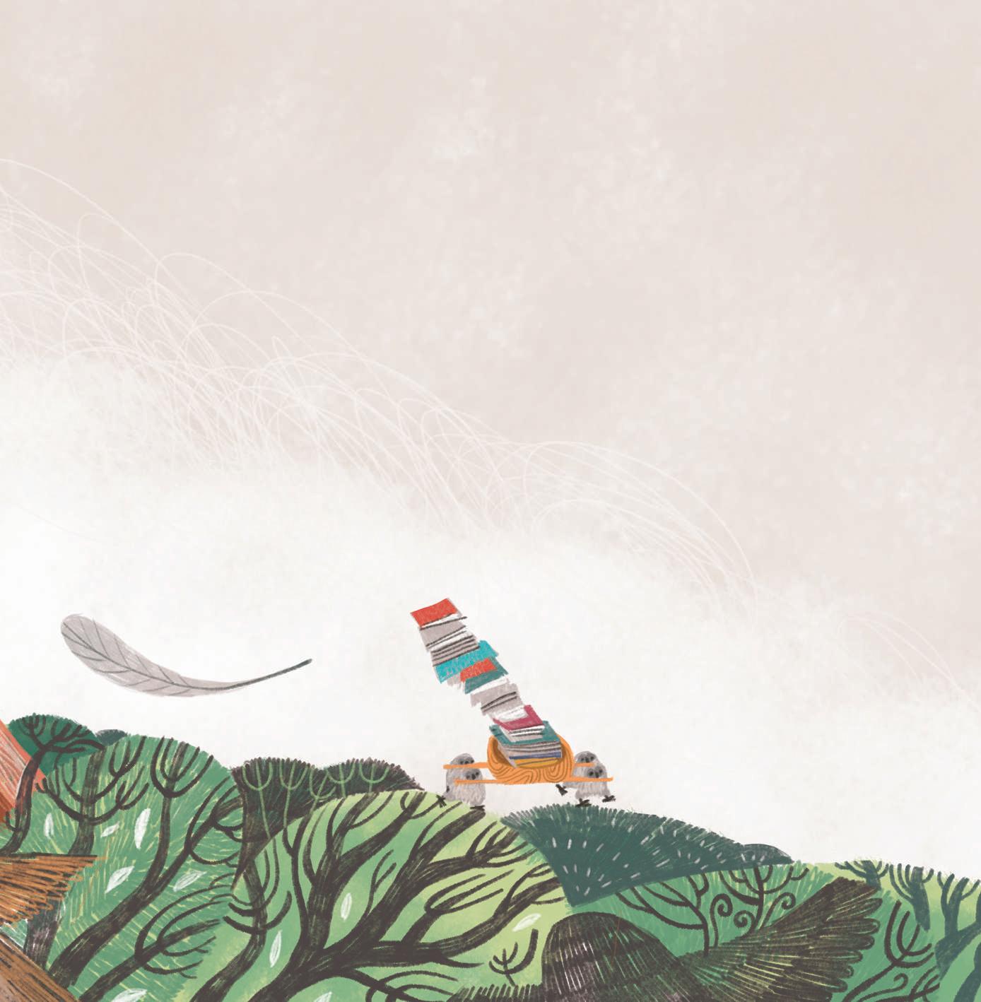 越來越多的大貓頭鷹改用箱子來裝更多的書,然後,用爪子抓住箱子,展翅高飛,飛向山城……