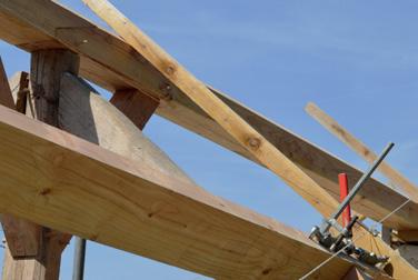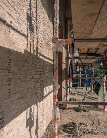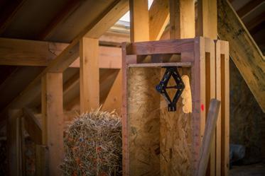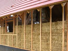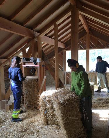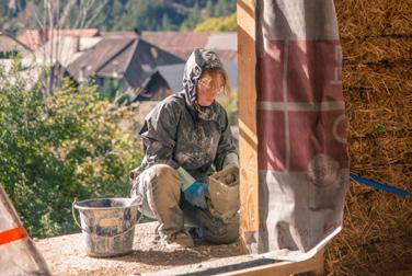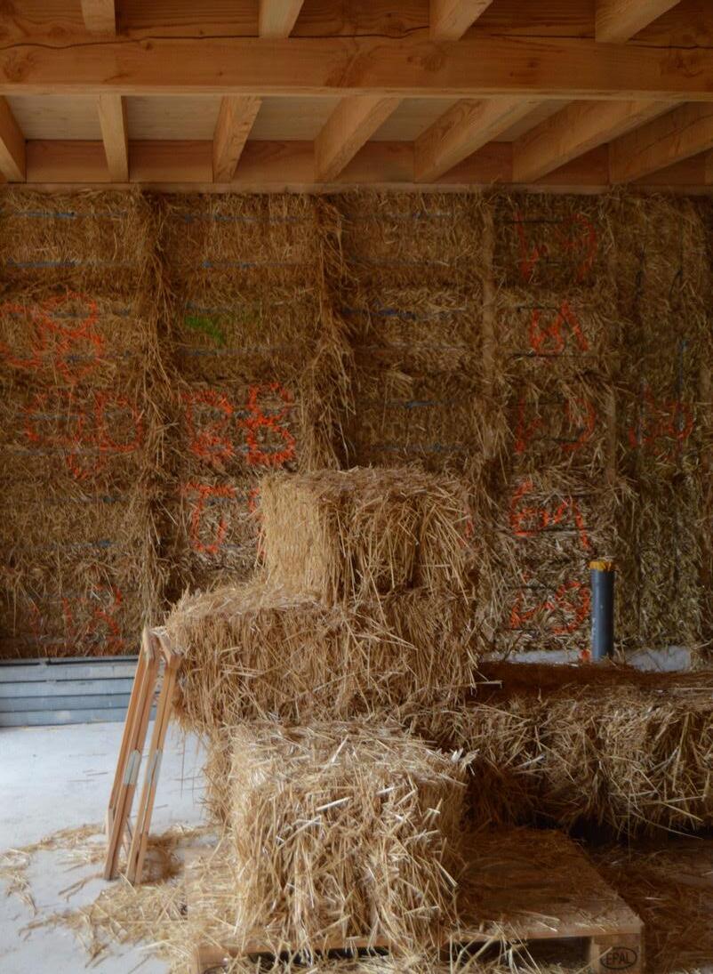 * straw bale insulation, lime plaster covering outside facades, wood work