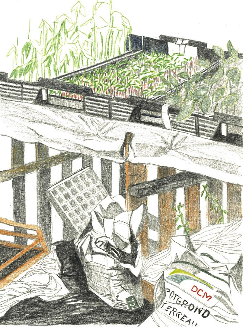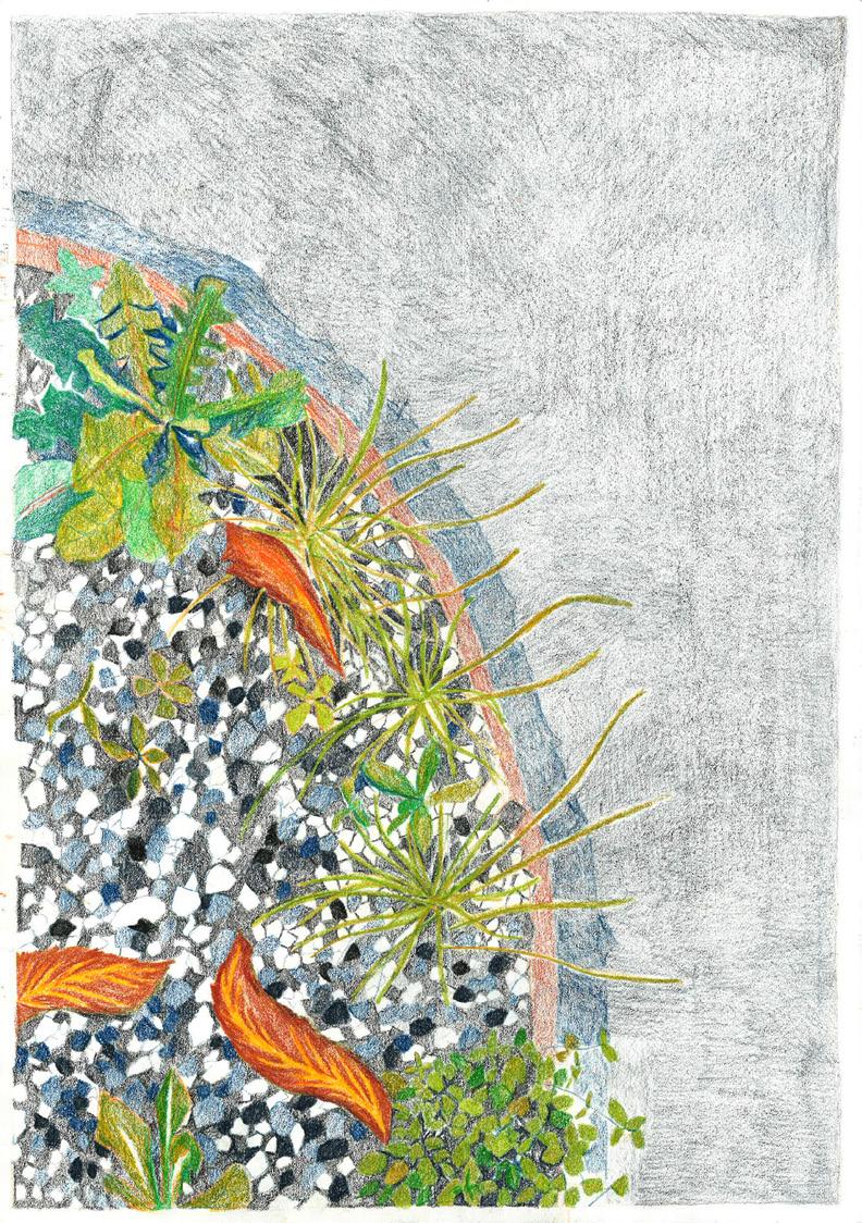 This series of drawings look at some scenes taking into account more-than-humans around the emblematic building of De Singel in Antwerp. In the context of a general exhibition about the living world in architecture, these couple of drawings show the place-making of lichens, bacteria, algae, weeds, birds, insects, and other mammals. A corner of the pool basin is taken over by leaves becoming compost. The holes in the tar allow glimpses of weeds as well as a new porosity with water and air. The turtles of the neighbors are finding a new home among the algae. The droppings of an animal marking its territory on top of a concrete wall.