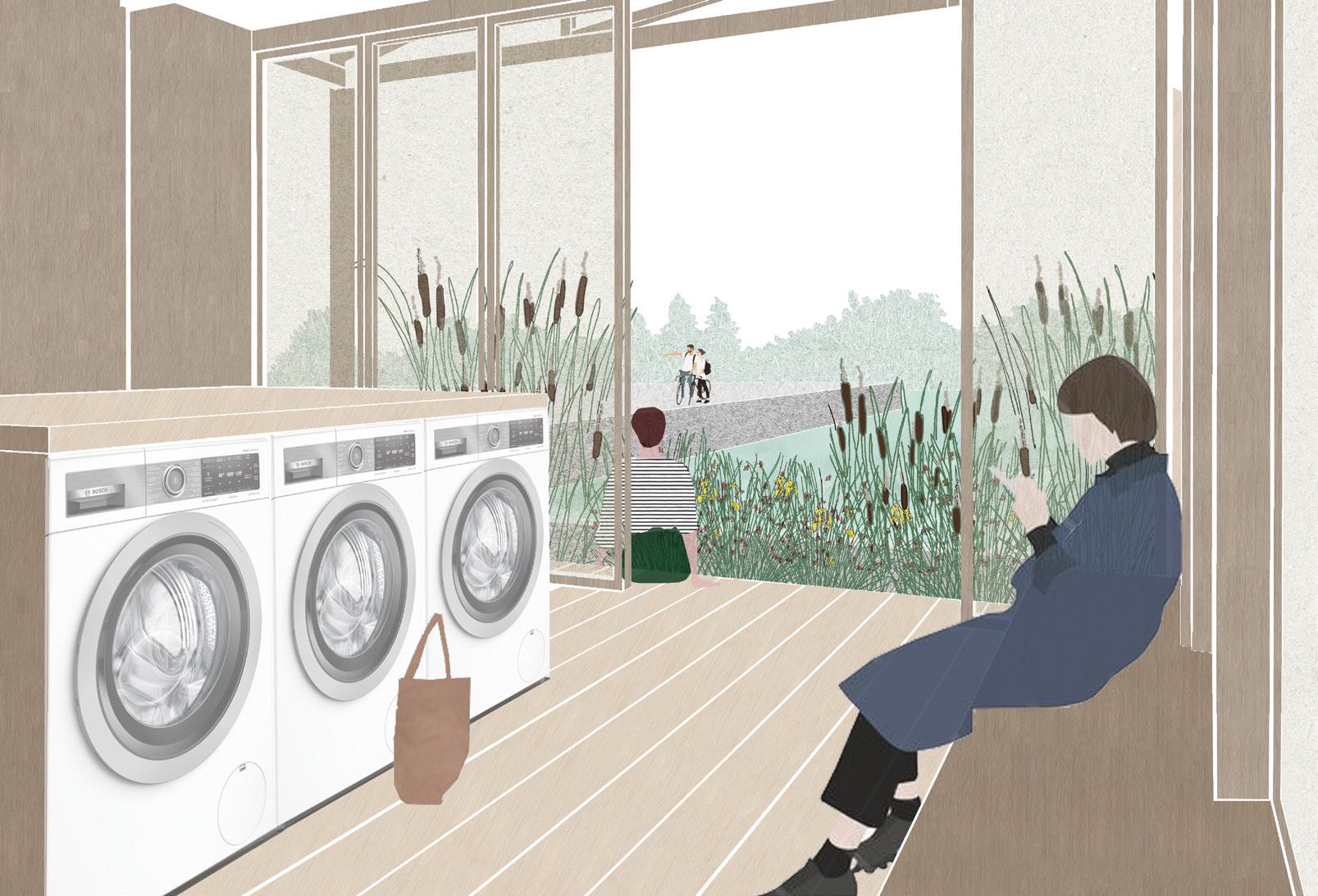 The Deûle is a northern river, crossing the city of Lille, and almost all of which has been channeled. Its balance has been strongly impacted by dense river transport as well as by the release of heavy metals from the industries. Initiatives have been implemented recently to improve its biological potential. The project is going into the same dynamic by offering a floating module to clean the polluted water of the Gare d’eau in Lille. The module sanitizes polluted water to supply a neighborhood laundromat. This public equipment emphasizes the working past of the Bois Blancs island. Inhabitants are thus legitimized facing the new influence of the Euratechnologie center. A shared daily facility that could also serve the inhabitants from the barges. The module deals with both social and ecological concerns, by making the ritual of the laundry support raising awareness about the Deûle ecosystem. It is therefore a laboratory in the physicochemical sense of sanitation by plants but also educational thanks to the visibility of the process by the inhabitants. The inhabitants coming to wash their clothes could enjoy a peaceful time in the floating garden.