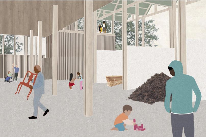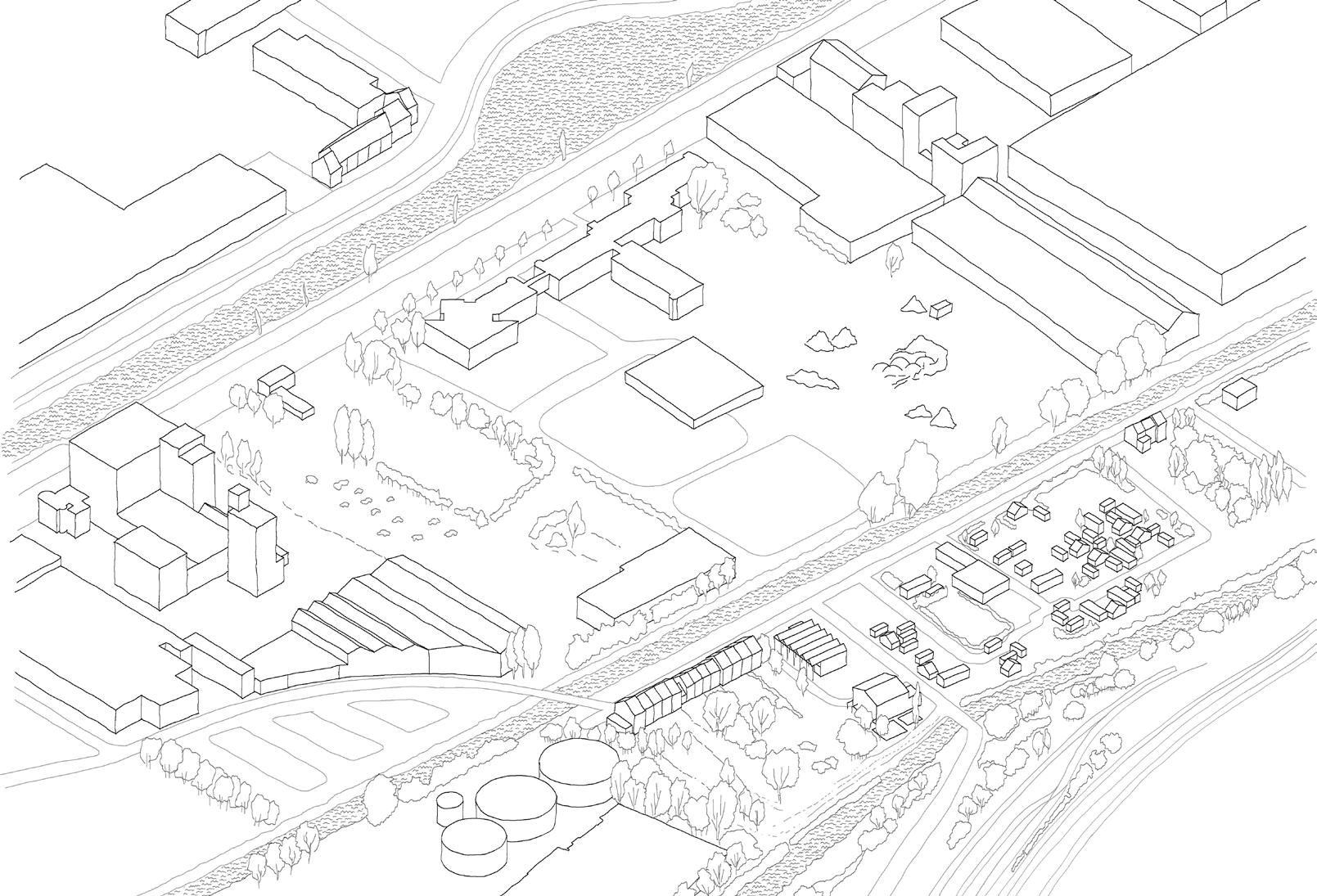 The project is located North of Leuven in between the railways, the Dyle River, and an industrial area. The site was chosen to look at the ‘back’ of the city, where trucks are parked, and where we let the grass grow. Standard workers ’houses and a village of bungalows are also located next to the chosen plot. How to encourage mixing functions within the industrial area and the housing street, outside of the already constituted city? The project will become medium-sized public equipment to collect materials from the industries nearby and share the production of energy to reuse in the daily life of the inhabitants. At the same time, an urban strategy will open pathways, and gateways to cross the railways, the water, and the industrial area. This landscaping promotes the already existing biodiversity on site.