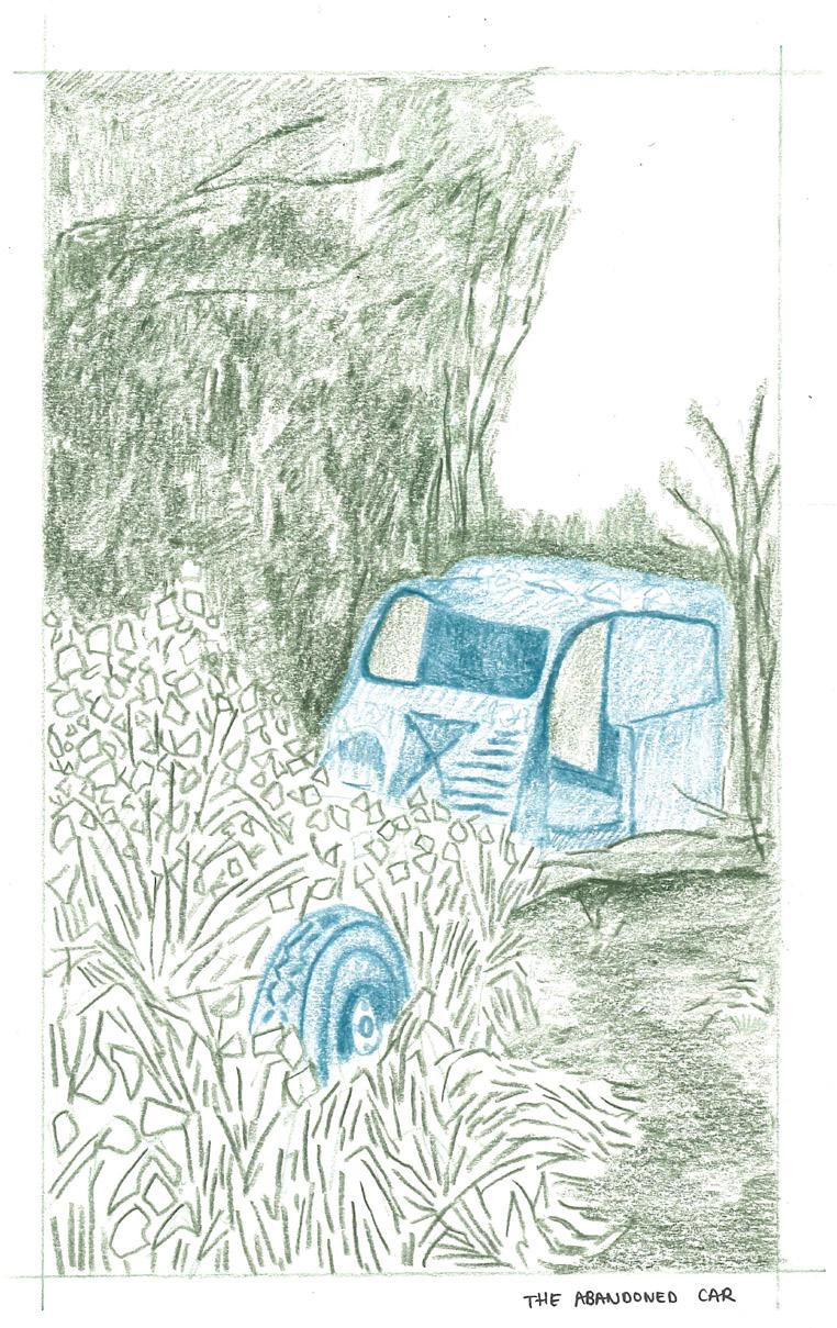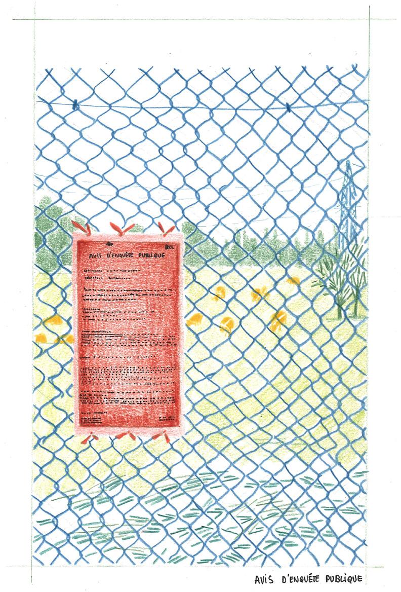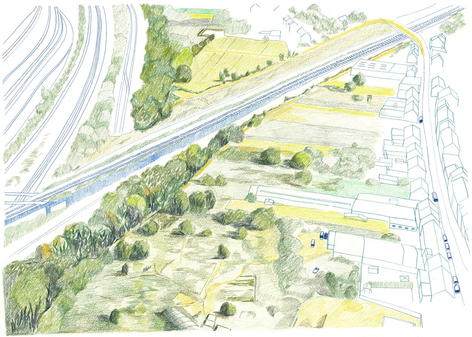 From a broader view, in association with the general map, the perspective drawings show places where intricate stories happen between species, different temporalities, and appropriation. Such as the abandoned car that could become a game for kids. Or the sheep meadow where a red poster indicates a potential project of a housing complex, the pasture facing the real estate promotion. The stories talk about invisible uses or in negotiation, struggles happening on the ground.