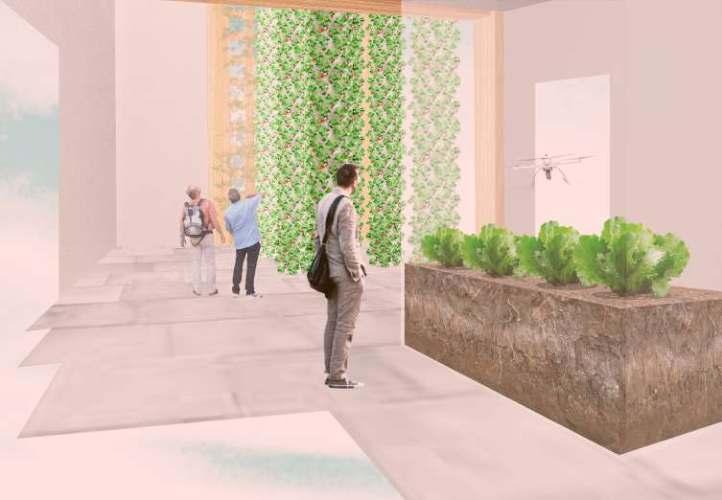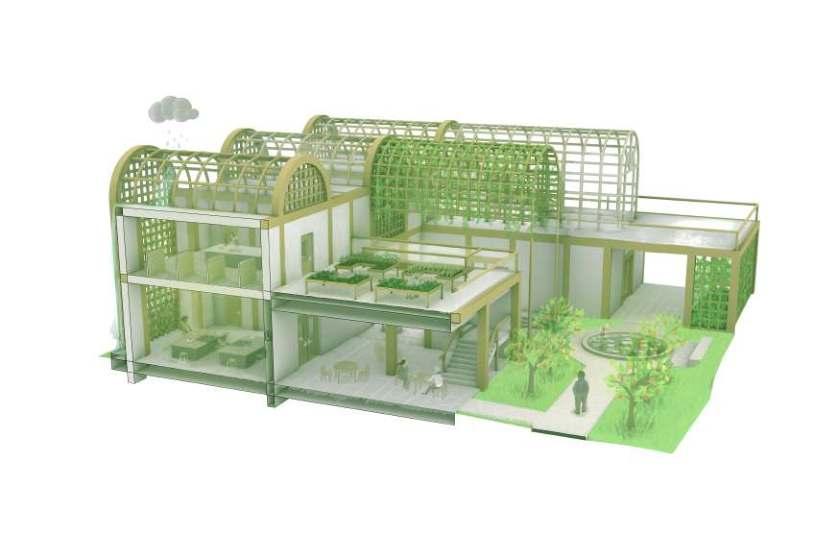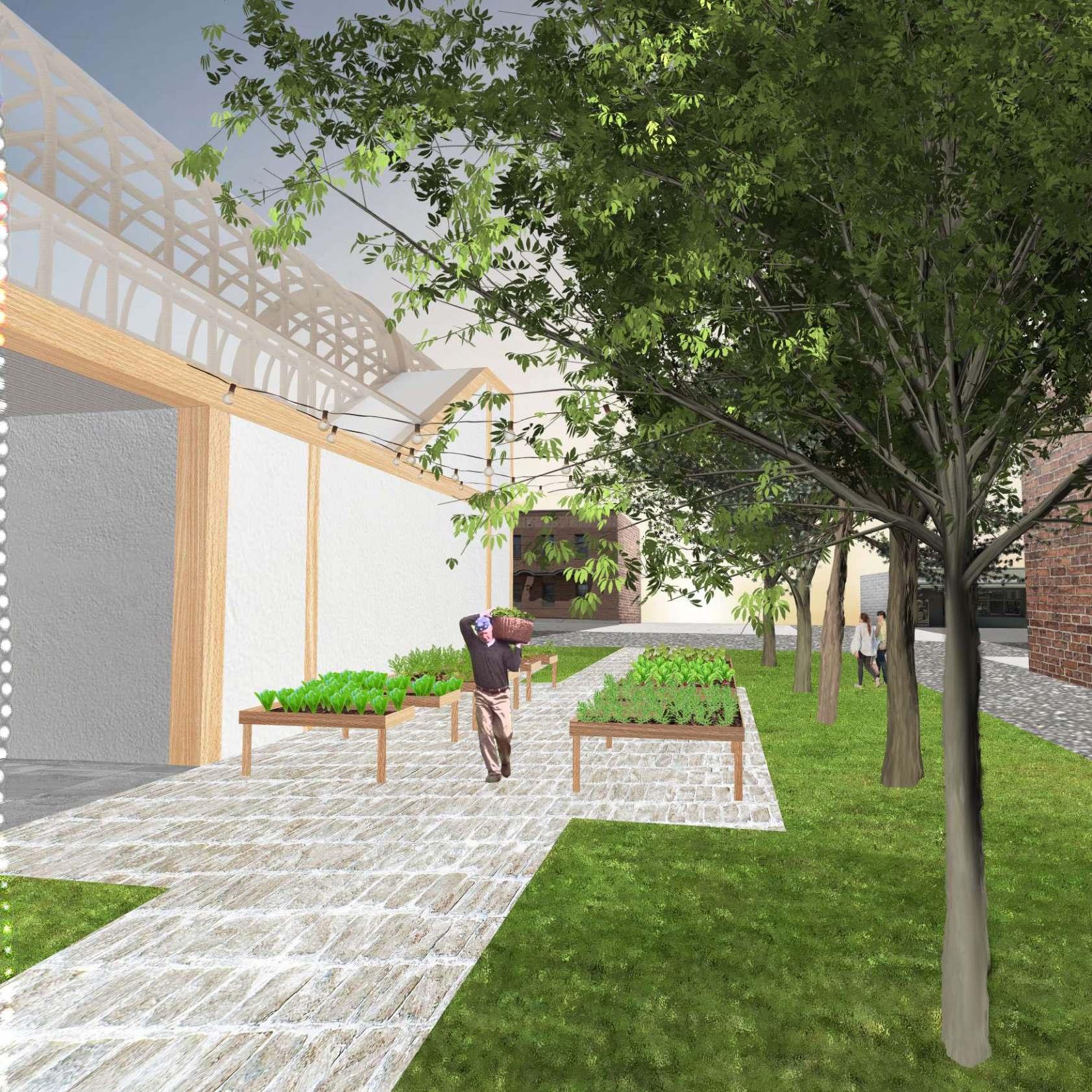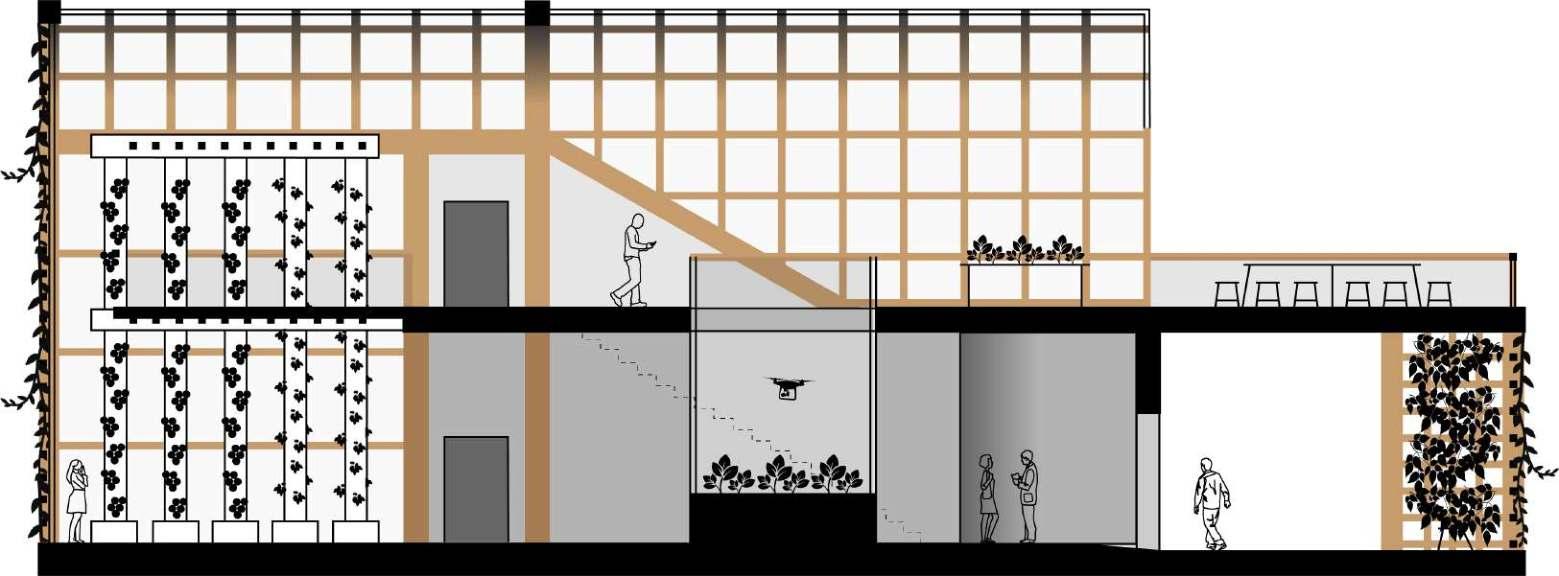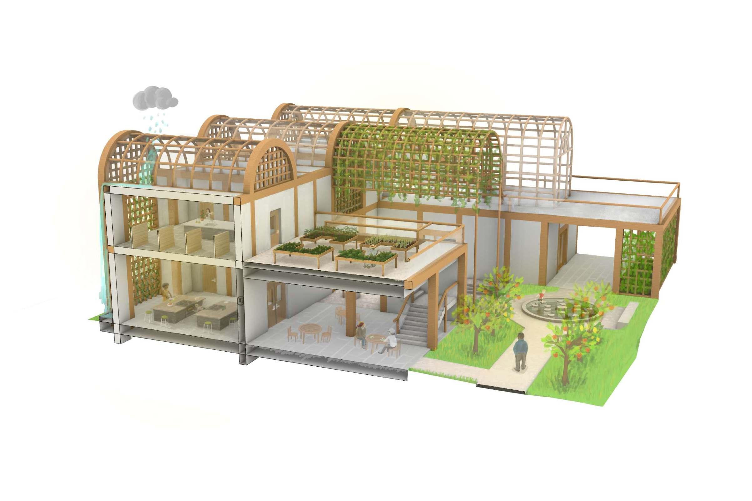 RENDERING COLLAGES (LEFT TO RIGHT): INTERIOR GROWING SPACE, MAIN ENTRANCE, KITCHEN/COOKING CLASSROOM