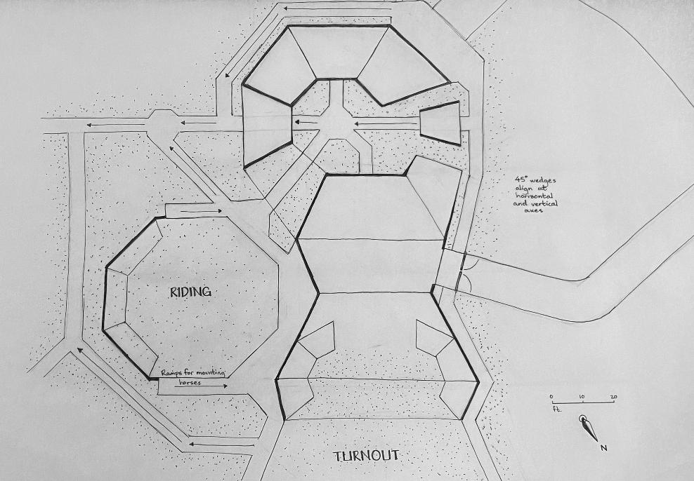 The Norman Equine Assisted Therapy Center is a proposed addition to the JD McCarty Center for Children with Disabilities, in which summer campers could participate in therapeutic activities such as riding and caring for horses. This was a challenging program, as I had to consider the needs of the horses, the staff, and the young campers, whose differing abilities demand a strong attention to universal design. During this project, I learned a lot about analyzing a site, formally organizing spaces, and managing the complex requirements of a building, and, while there are many things I wish I had done differently in retrospect, it helped me a lot with my future projects. This project also taught me both the importance and the specific requirements of designing for people with disabilities.