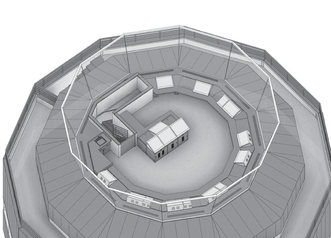 The 10-sided polygon tower are integrated with the control cab. The tower floor level is 109 feet above ground level with precast concrete wall panels forming the building envelope.