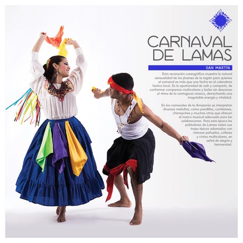 CARNAVAL DE LAMAS San MartIn Esta recreación coreográfica muestra la natural sensualidad de los jóvenes de la región para quienes el carnaval es más que una fecha en el calendario festivo local. Es la oportunidad de salir y compartir, de conformar comparsas multicolores y bailar sin descanso al ritmo de la contagiosa música, derrochando una inagotable energía y vitalidad. En los carnavales de la Amazonía se interpretan diversas melodías, como pandillas, cumbiones, chimayches y muchas otras que ofrecen el marco musical adecuado para las celebraciones. Para esta época los pobladores de Lamas visten sus trajes típicos adornados con vistosos pañuelos, collares y cintas multicolores, en señal de alegría y hermandad.
