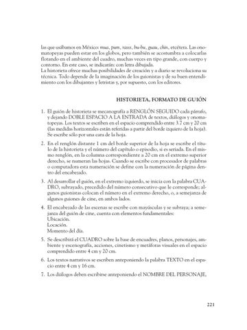 las que usábamos en México: mua, pum, rasss, bu-bu, guau, chin, etcétera. Las onomatopeyas pueden estar en los globos, pero también se acostumbra a colocarlas flotando en el ambiente del cuadro, muchas veces en tipo grande, con cuerpo y contorno. En este caso, se indicarán: con letra dibujada. La historieta ofrece muchas posibilidades de creación y a diario se revoluciona su técnica. Todo depende de la imaginación de los guionistas y de su buen entendimiento con los dibujantes y letristas y, por supuesto, con los editores. HISTORIETA, FORMATO DE GUIÓN 1. El guión de historieta se mecanografía a RENGLÓN SEGUIDO cada párrafo, y dejando DOBLE ESPACIO A LA ENTRADA de textos, diálogos y onomatopeyas. Los textos se escriben en el espacio comprendido entre 3.7 cm y 20 cm (las medidas horizontales están referidas a partir del borde izquiero de la hoja). Se escribe sólo por una cara de la hoja. 2. En el renglón distante 1 cm del borde superior de la hoja se escribe el título de la historieta y el número del capítulo o episodio, si es seriada. En el mismo renglón, en la columna correspondiente a 20 cm en el extremo superior derecho, se numeran las hojas. Cuando se escribe con procesador de palabras o computadora esta numeración se define con la numeración de página dentro del encabezado. 3. Al desarrollar el guión, en el extremo izquierdo, se inicia con la palabra CUADRO, subrayado, precedido del número consecutivo que le corresponde; algunos guionistas colocan el número en el extremo derecho, o, a semejanza de algunos guiones de cine, en ambos lados. 4. El encabezado de las escenas se escribe con mayúsculas y se subraya; a semejanza del guión de cine, cuenta con elementos fundamentales: Ubicación. Locación. Momento del día. 5. Se describirá el CUADRO sobre la base de encuadres, planos, personajes, ambiente y escenografía, acciones, cinetismo y metáforas visuales en el espacio comprendido entre 4 cm y 20 cm. 6. Los textos narrativos se escriben anteponiendo la palabra TEXTO en el espacio entre 4 cm y 16 cm. 7. Los diálogos deben escribirse anteponiendo el NOMBRE DEL PERSONAJE,