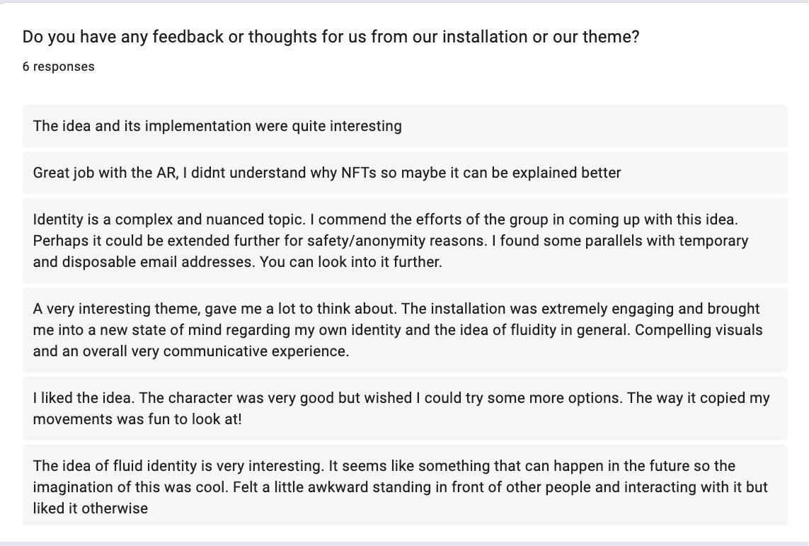 We will be taking this feedback into account if we develop our project further. For instance, if someone feels awkward standing in front of people while interacting with out installation, we can create a barrier so only one person can experience it at a time. We can also include more options for them to choose from. We would also look into the safety/anonymite concern expressed by one of the participants.
