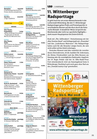 11. Wittenberger Radsporttage Es geht hoch her am ersten Maiwochenende in der Lutherstadt Wittenberg. Bei den 11. Wittenberger Radsporttagen gehen Profis und Freizeitsportler in verschiedenen Rennen auf den Kurs durch die historische Altstadt. In bewährter Weise verspricht das Wochenende aber nicht nur sportliche Highlights – dank neuem Hauptsponsor bei freiem Eintritt. Rock mit „The Jailbreakers“, Partystimmung mit der „Max Demian Band“ und Schlagerspaß mit „Franziska“ und den „Lederhosen Matrosen“: Die Radsporttage halten auch für alle Besucher einiges bereit, die sich nicht selbst auf den Sattel schwingen. Zentrales Element sind aber natürlich die verschiedenen Zweiradevents, ob die Ausfahrt für Jedermann, die Kleine Friedensfahrt und das Elite-Rennen am Samstag oder die sonntäglichen Radwander-Angebote der 19. Regio Pedale und der 16. Elbe-Radel-Tour. Und zwischendurch wird am Samstagabend beim 8. Wittenberger Nachtlauf auch noch ganz ohne Rad um den „Town&Country-Cup“ gewetteifert.