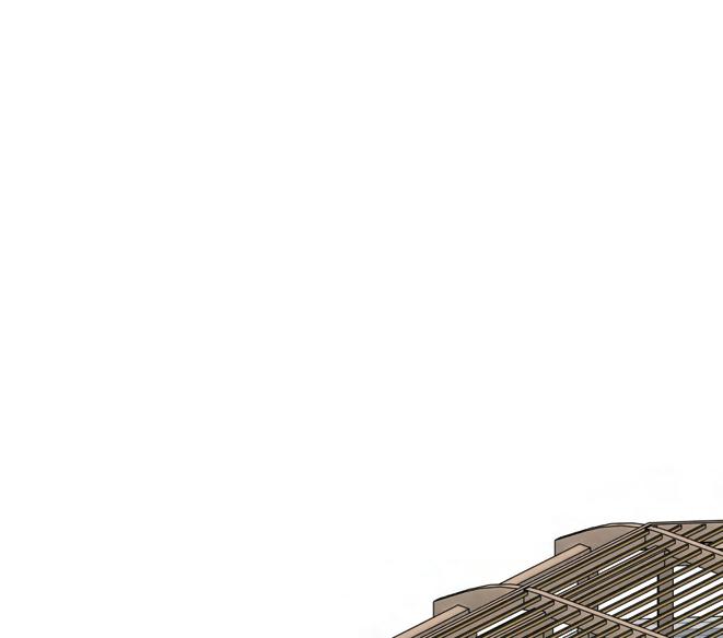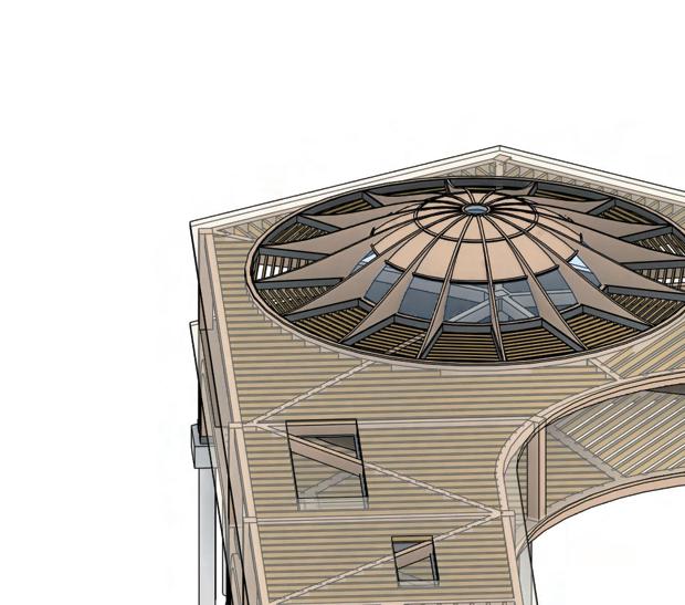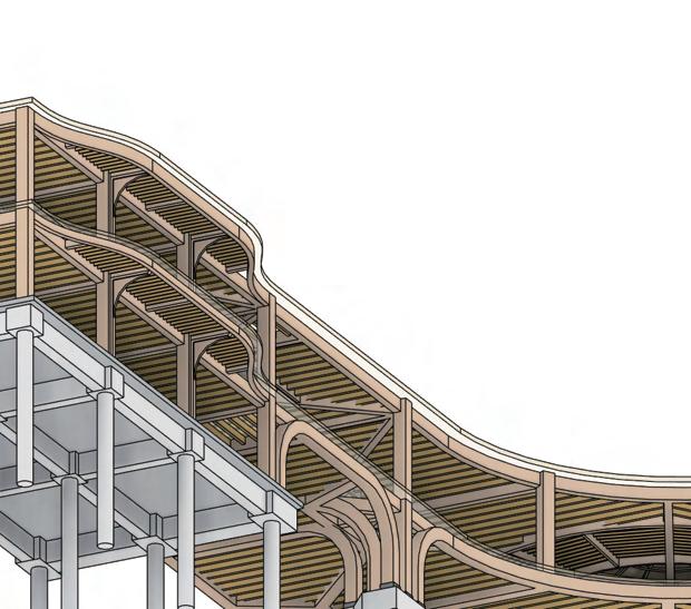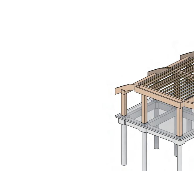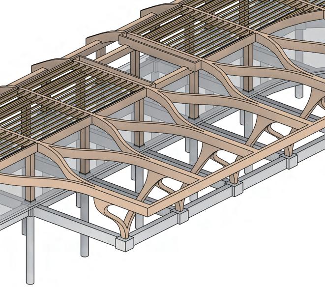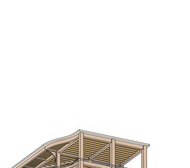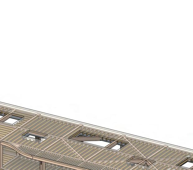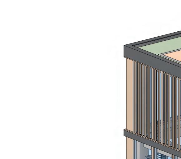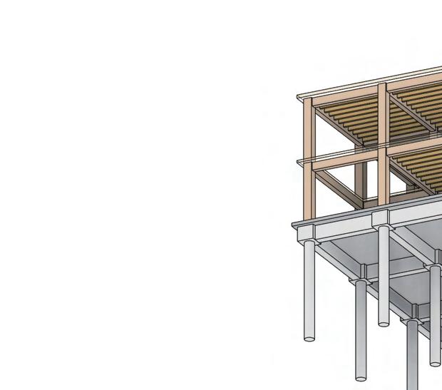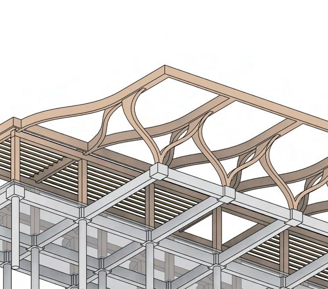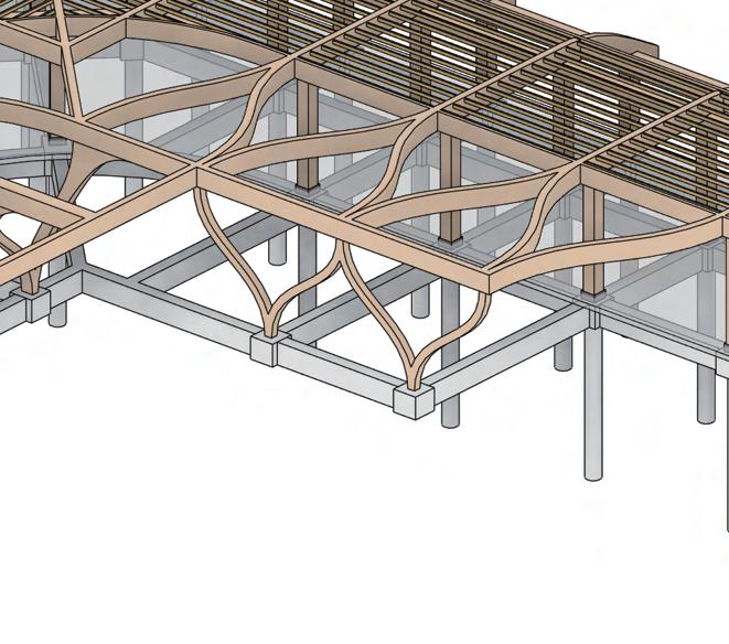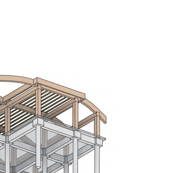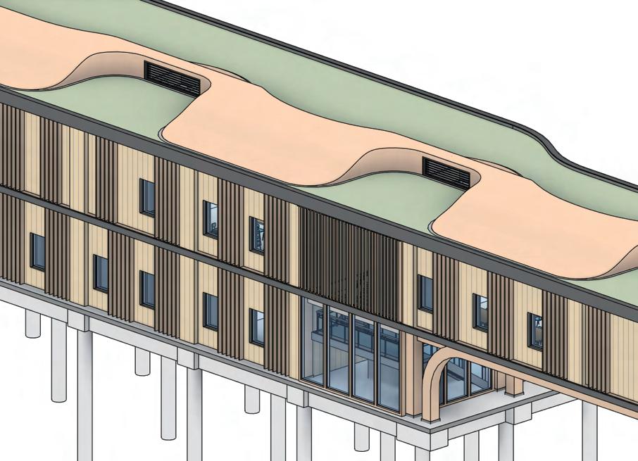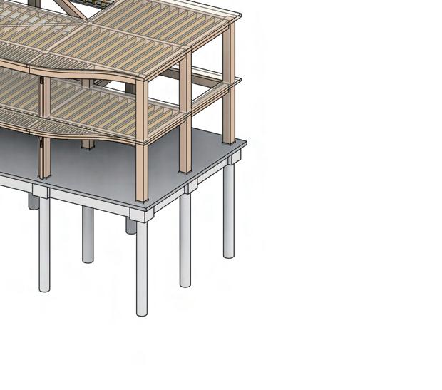 The multi-use building follows the same structural strategy, utilizing a glulam column and beam frame for the main structure. This system ensures consistency in material performance, aesthetic cohesion, and sustainable construction.