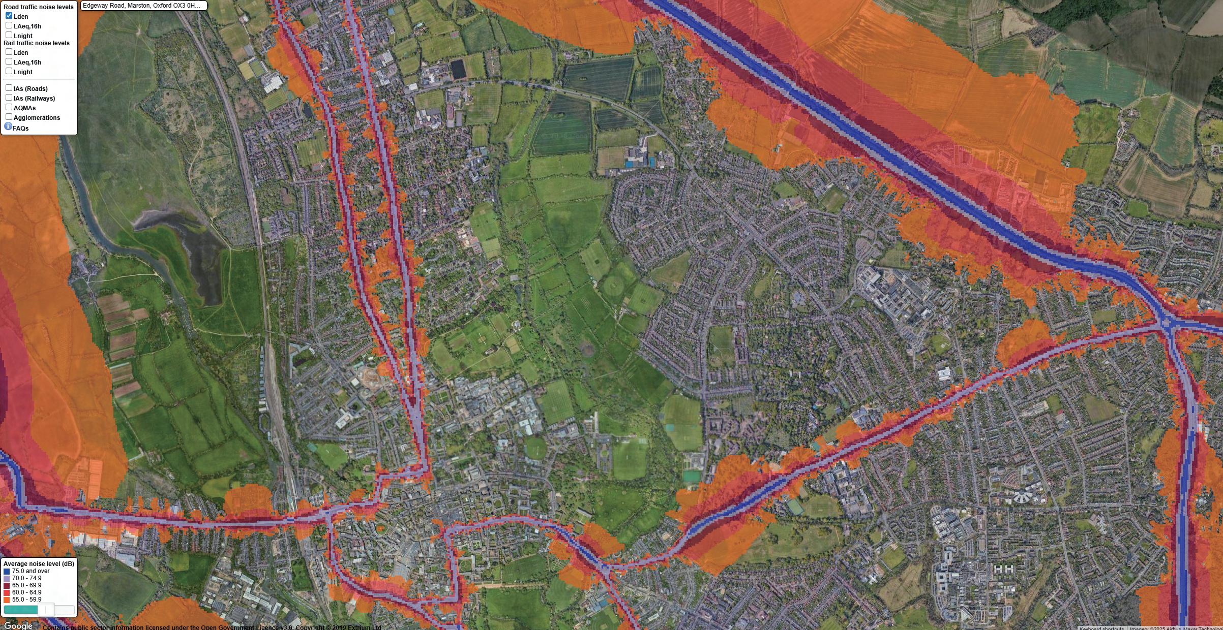 The map shows surrounding noise levels, with the highest from traffic in the southeast. The site itself has low noise levels, making it suitable for a calm learning environment.