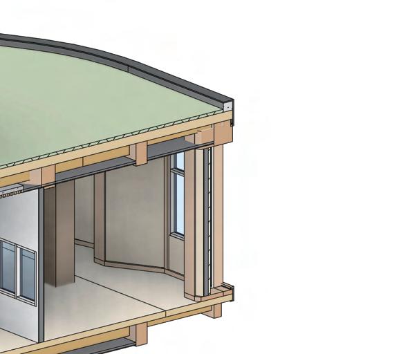 Cross-laminated timber (CLT) panels are used for the flooring system, supported by secondary timber joists, ensuring efficient load distribution and ease of construction.