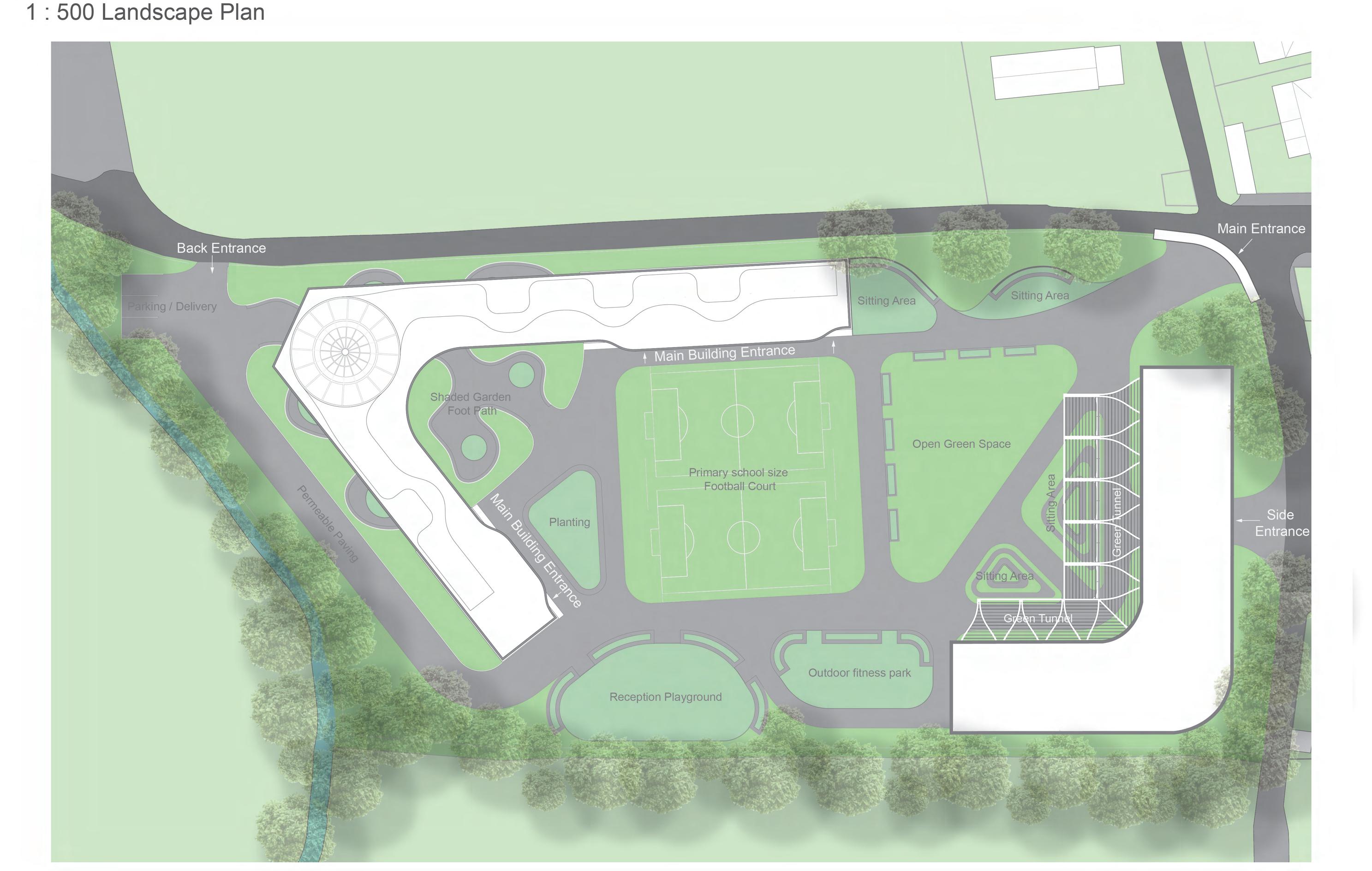The main entrance is designed for students, families, and the community. The space will include drop-off and pick-up zones. Entrance 2 serves the same function as the main entrance but is primarily for Reception students. It also serves as a safety access point for emergency evacuation. The Back Entrance is designed for unloading and parking, keeping it separate from the other two access points.