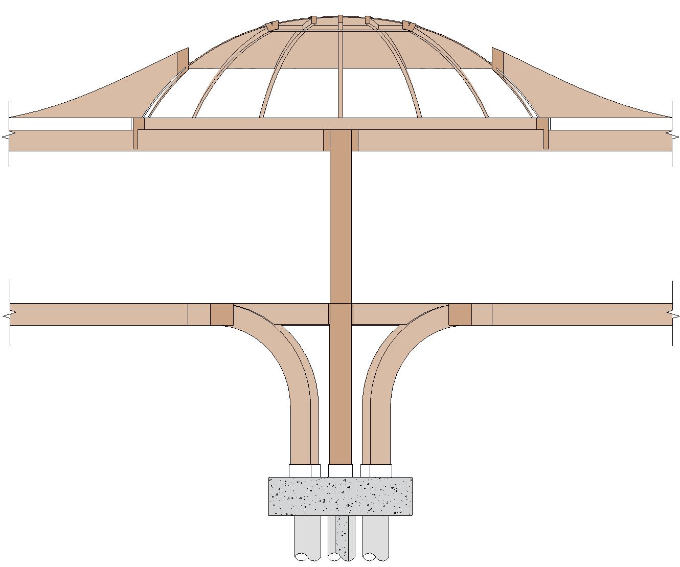 The building's main structural use a sustainable timber framework system. Glulam (glued laminated timber) columns and beams form the primary structural skeleton.