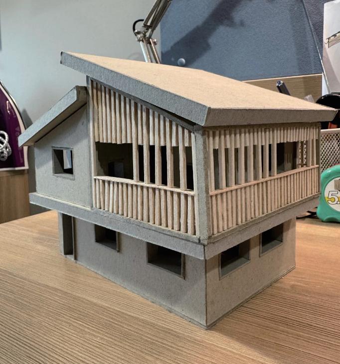 An open space layout on the ground floor creates a visually appealing environment, with natural lighting traveling through the space and creating an inclusive and accessible connection for the residents. The timber grille shading design for the balcony makes the space transparent but with privacy. Both bedrooms have two side windows that provide natural lighting, making the space more open and inviting.